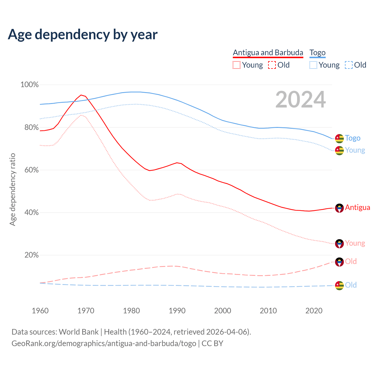 - Antigua and Barbuda is ranked 67/196 by median age (oldest to youngest) vs 166/196 for Togo.