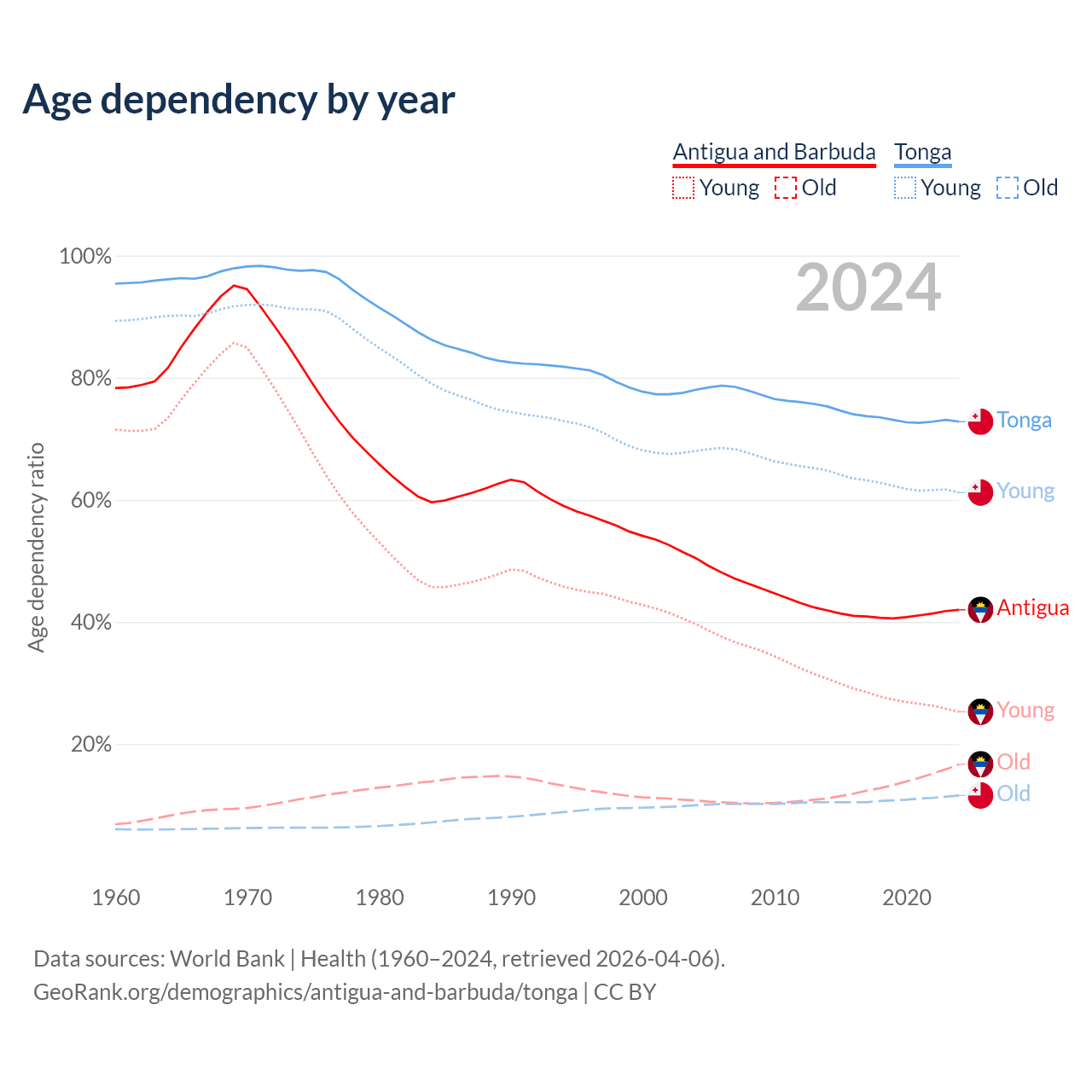 - Antigua and Barbuda is ranked 67/196 by median age (oldest to youngest) vs 149/196 for Tonga.