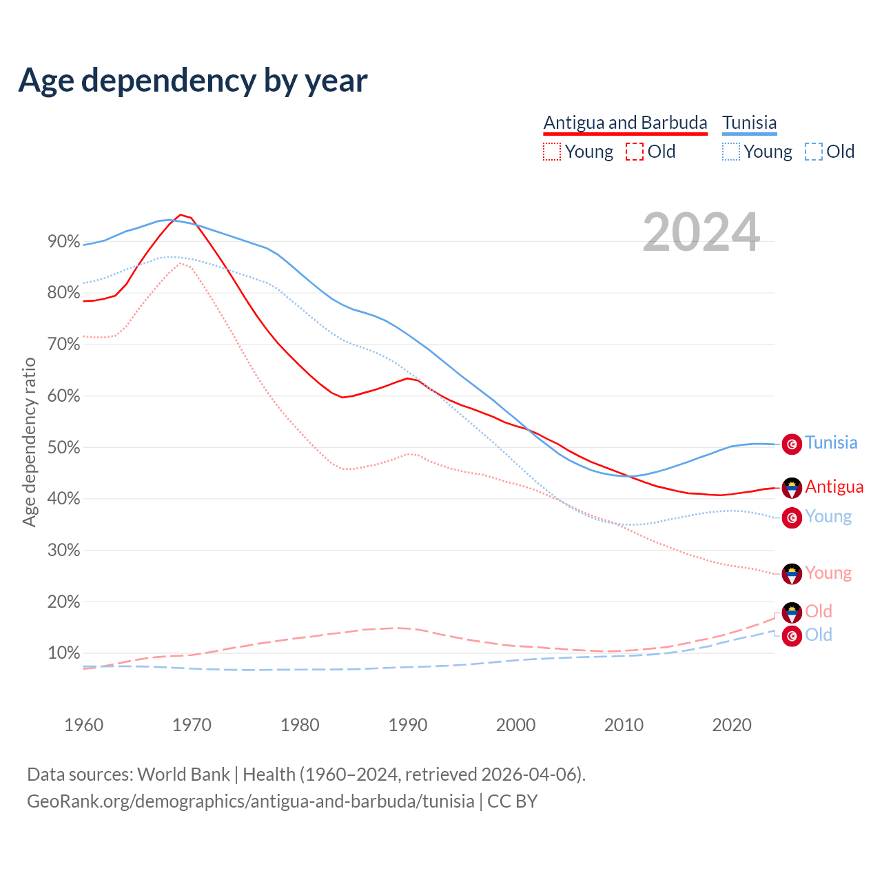 - Antigua and Barbuda is ranked 67/196 by median age (oldest to youngest) vs 86/196 for Tunisia.