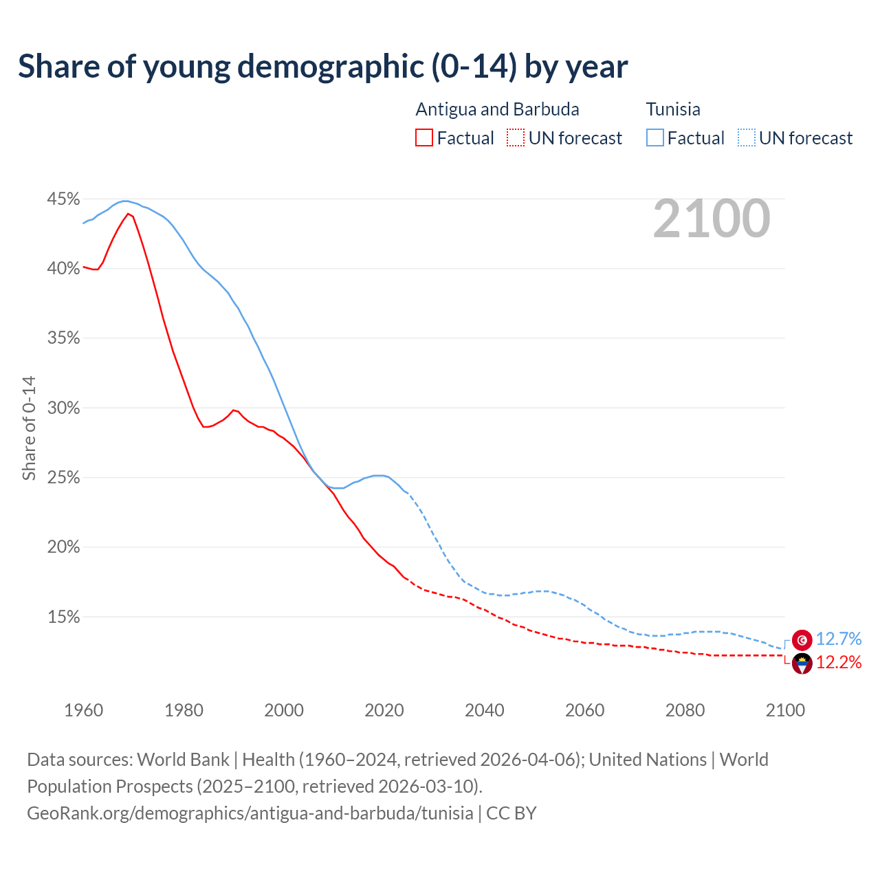 - The share of young demographic (0-15 years old) in Antigua and Barbuda is 17.8% vs 24% in Tunisia.