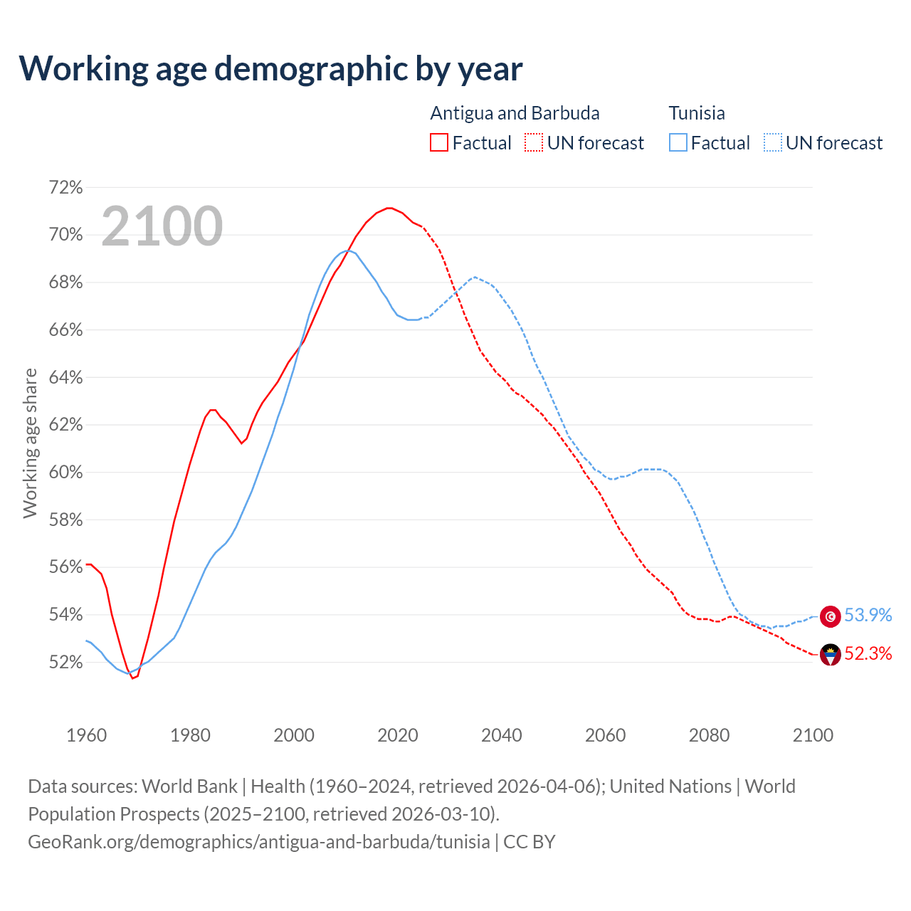 - Antigua and Barbuda has 66.7K working age adults (aged 15-64) vs 8.26M in Tunisia.