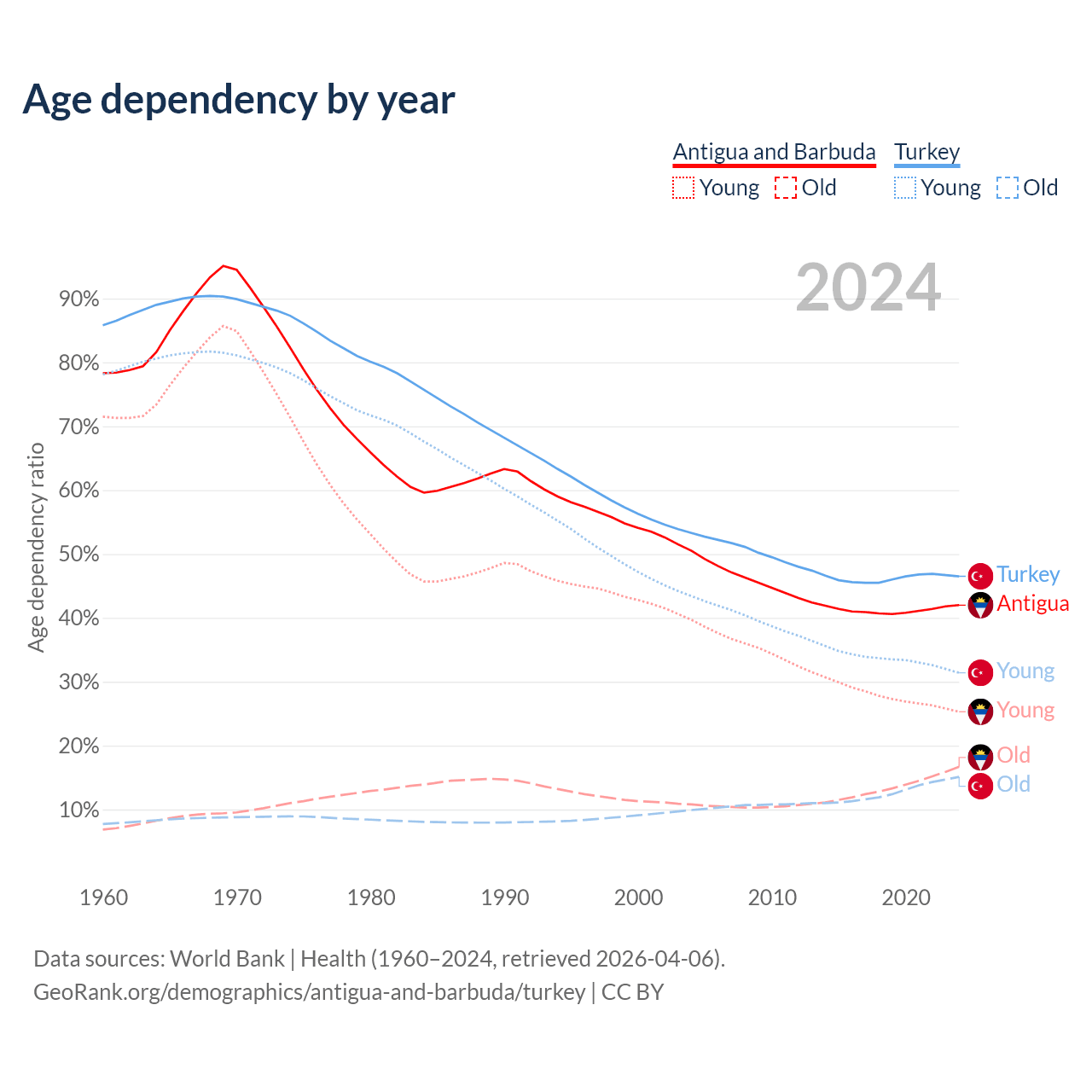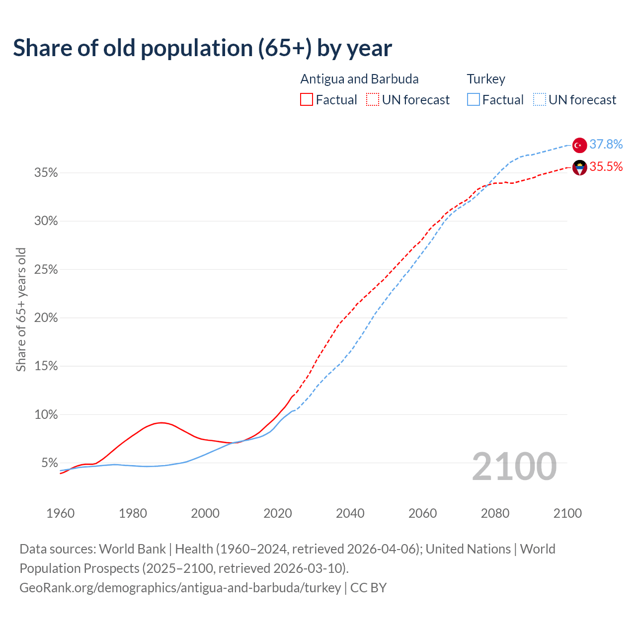 The share of older people aged 65 and over is 11.8% in Antigua and Barbuda and 10.3% in Turkey. Life expectancy in Antigua and Barbuda compared to Turkey .