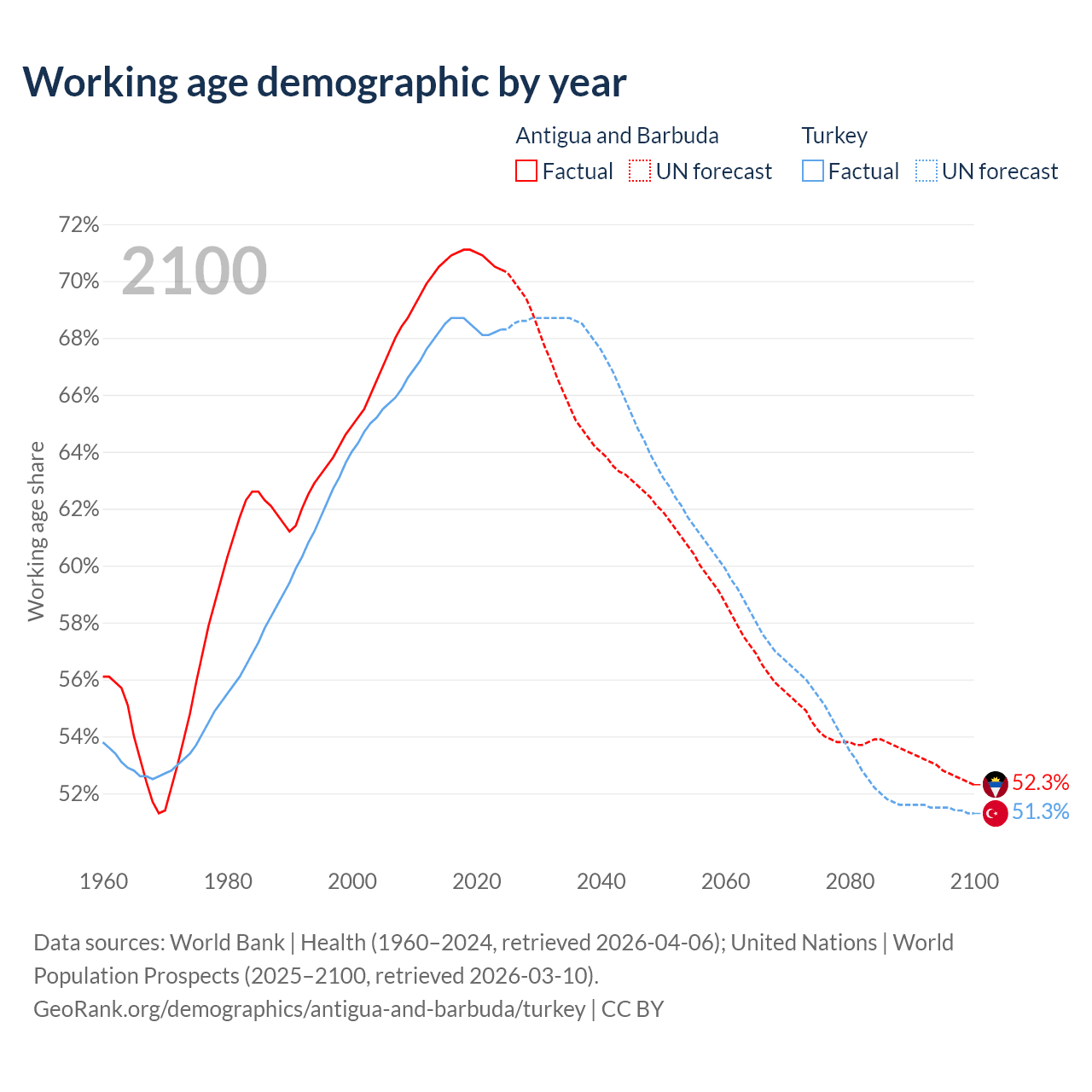 - Antigua and Barbuda has 66.7K working age adults (aged 15-64) vs 58.7M in Turkey.