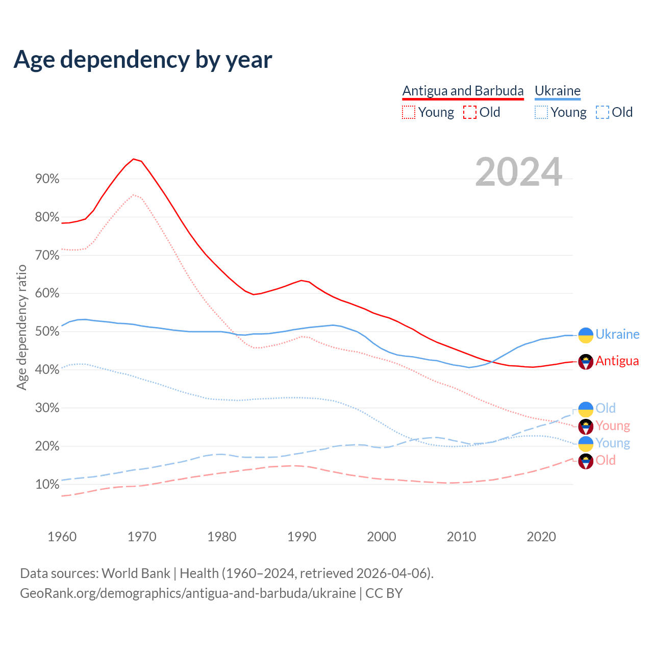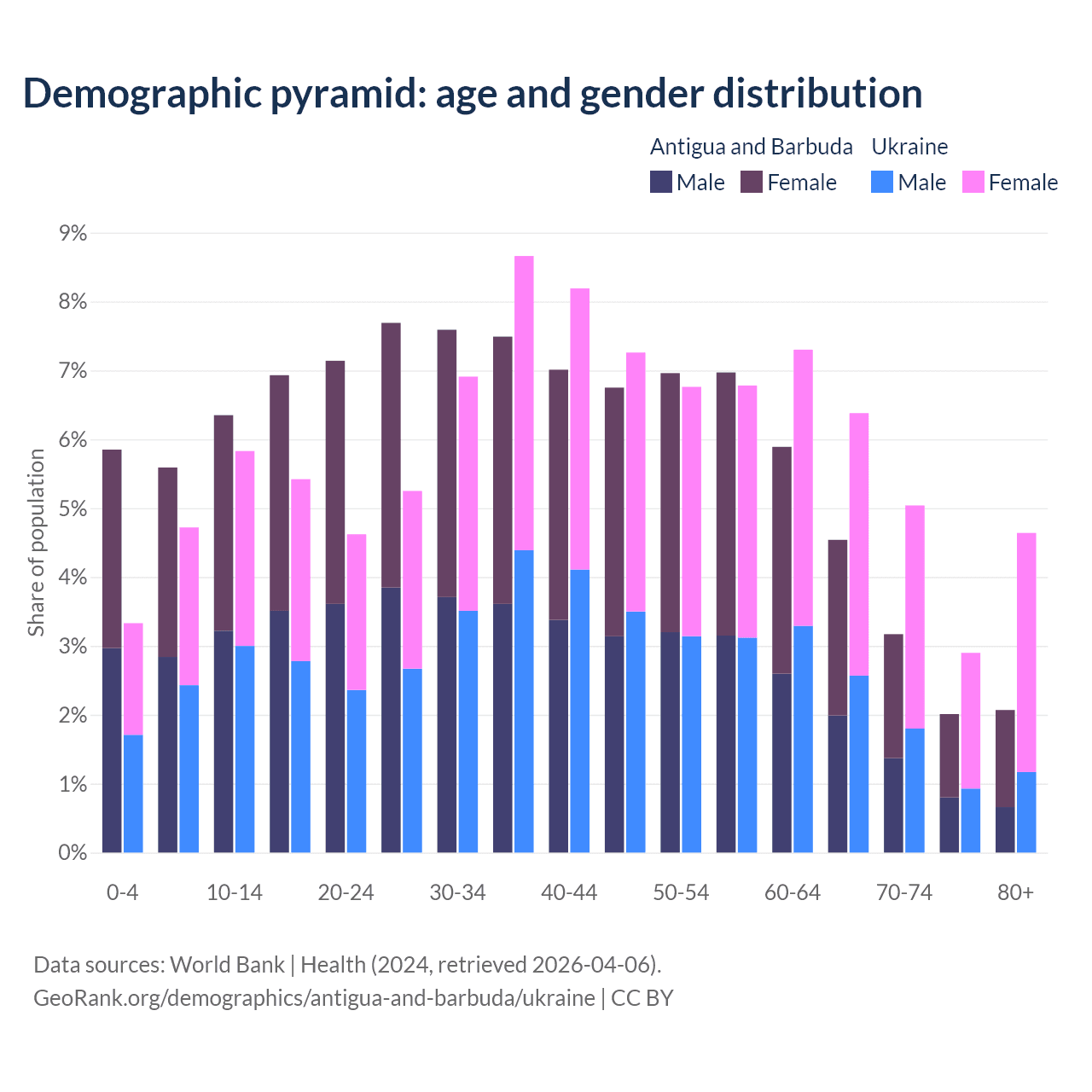- Antigua and Barbuda is ranked 67/196 by median age (oldest to youngest) vs 26/196 for Ukraine.