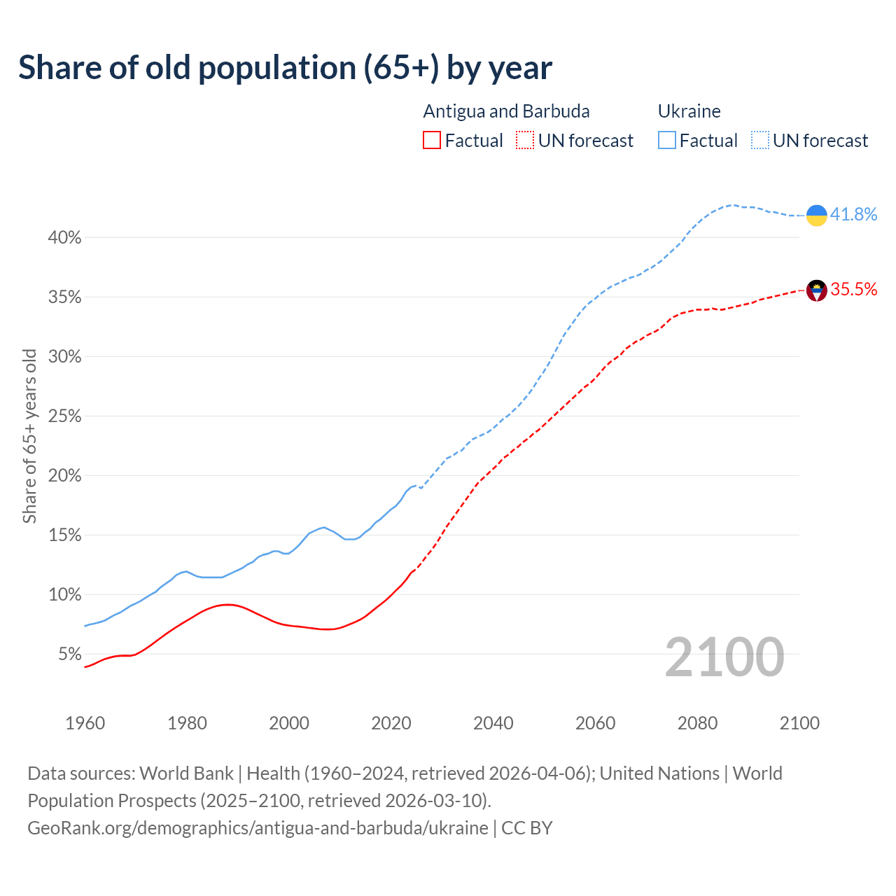 The share of older people aged 65 and over is 11.8% in Antigua and Barbuda and 19% in Ukraine. Life expectancy in Antigua and Barbuda compared to Ukraine .