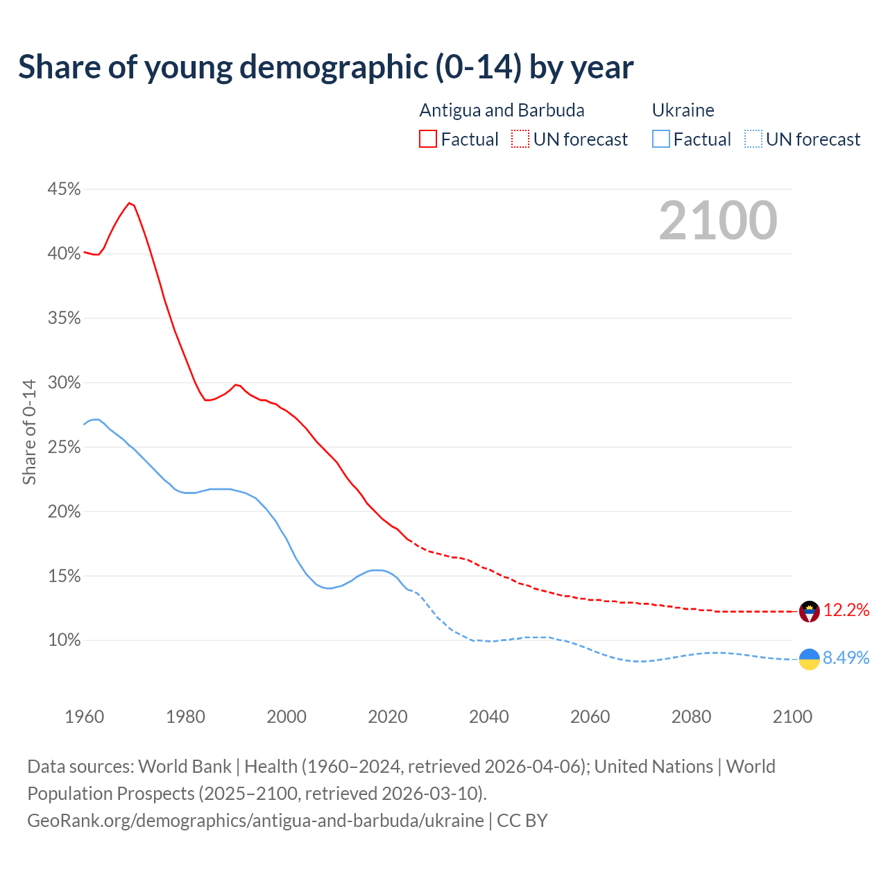 - The share of young demographic (0-15 years old) in Antigua and Barbuda is 17.8% vs 13.9% in Ukraine.