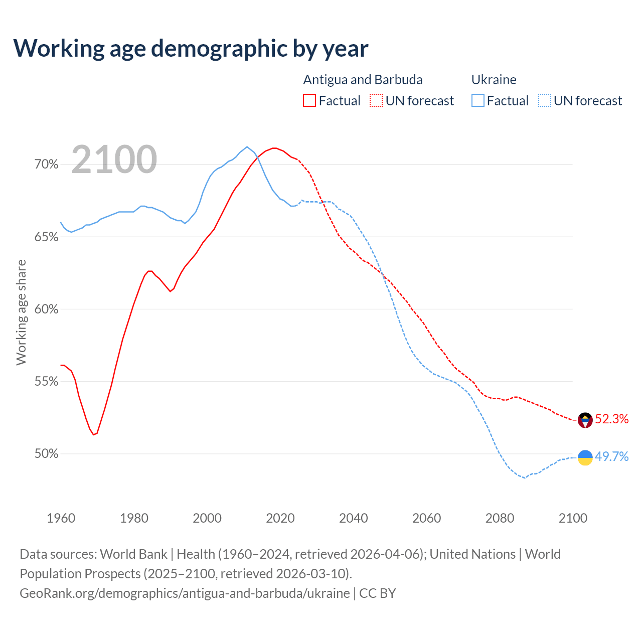 - Antigua and Barbuda has 66.7K working age adults (aged 15-64) vs 26.9M in Ukraine.