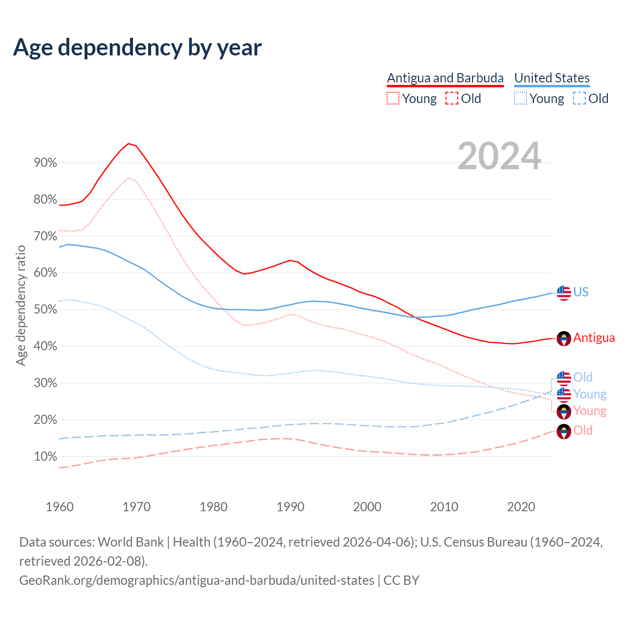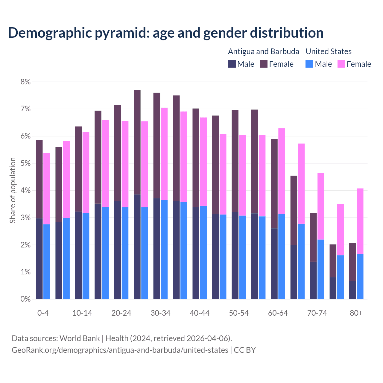 - The share of old-age demographic (65+) in Antigua and Barbuda is 11.8% vs 17.9% in the United States.
