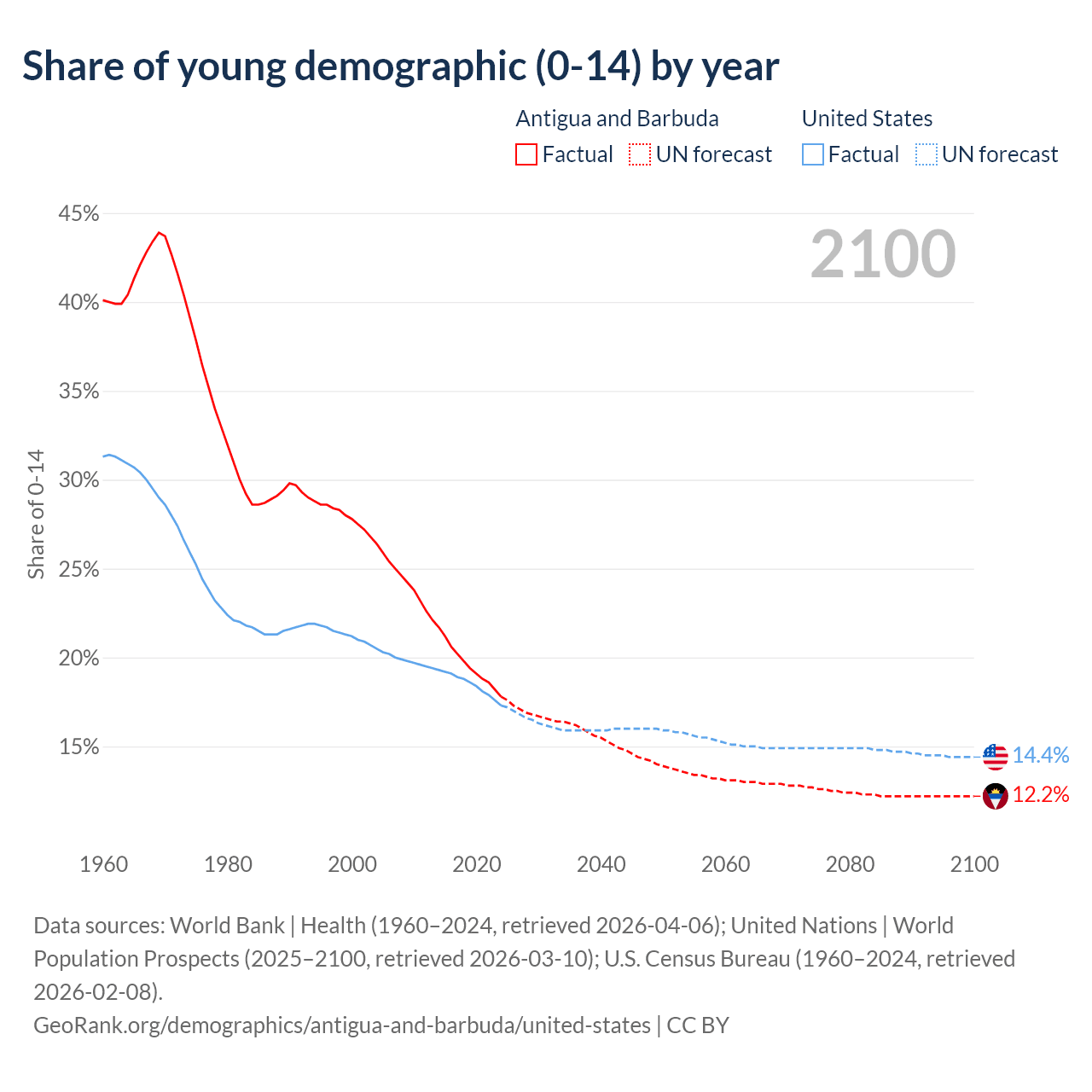- The share of young demographic (0-15 years old) in Antigua and Barbuda is 17.8% vs 17.3% in the United States.