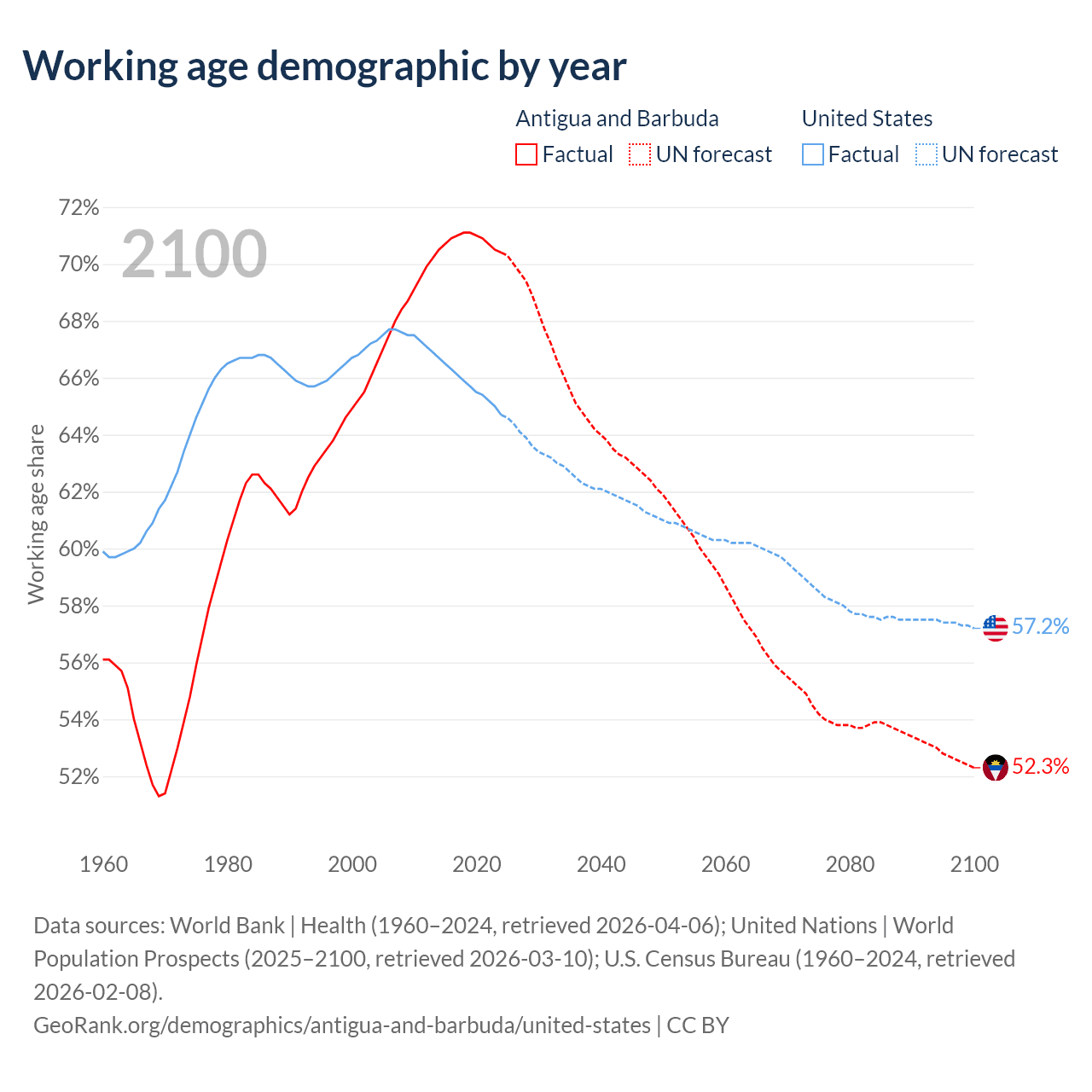 - Antigua and Barbuda has 66.7K working age adults (aged 15-64) vs 223M in the United States.