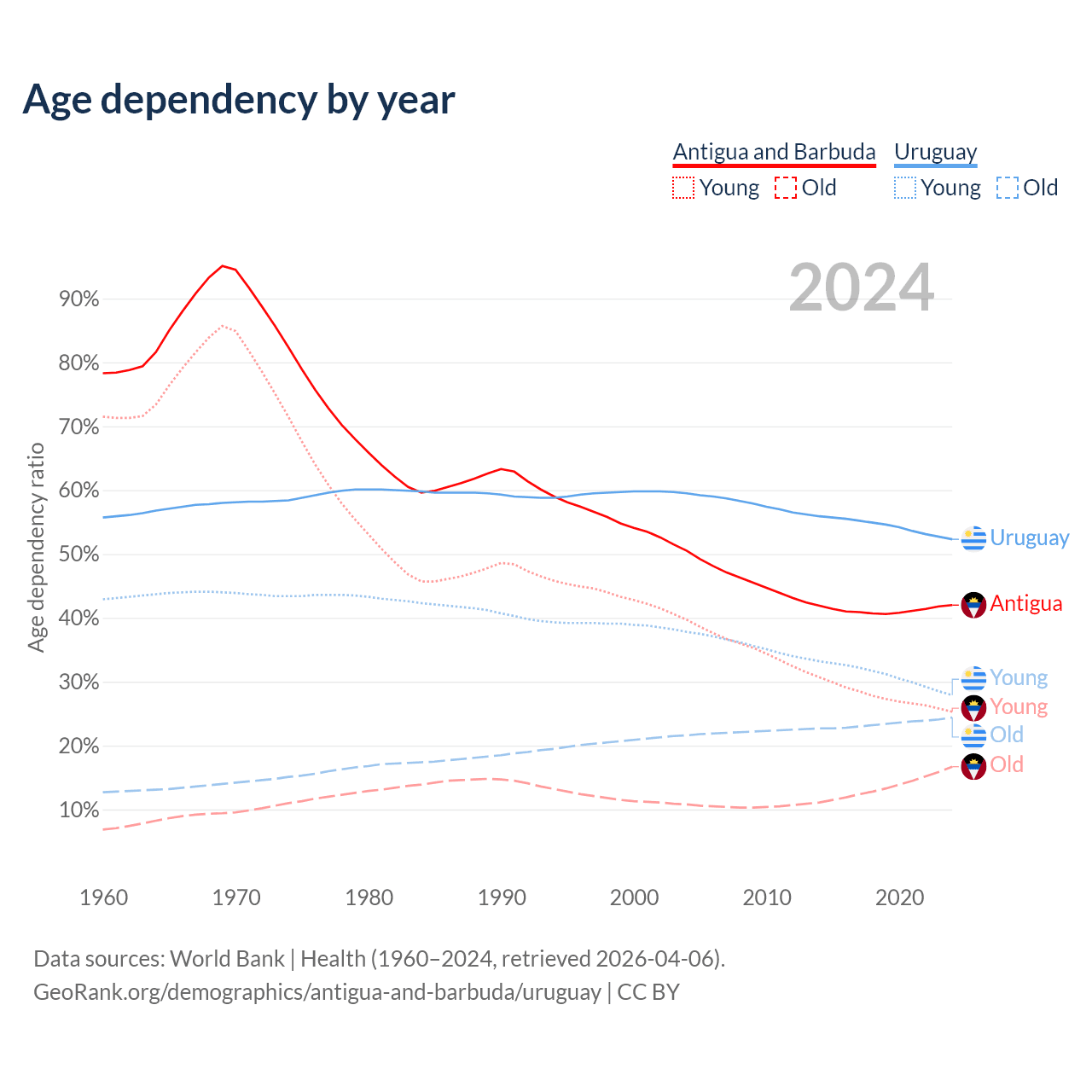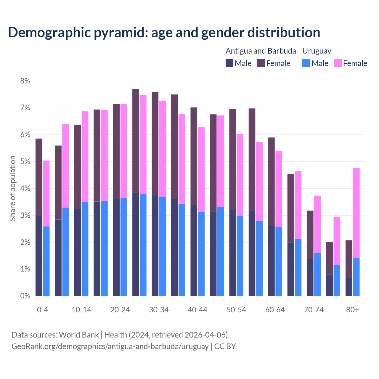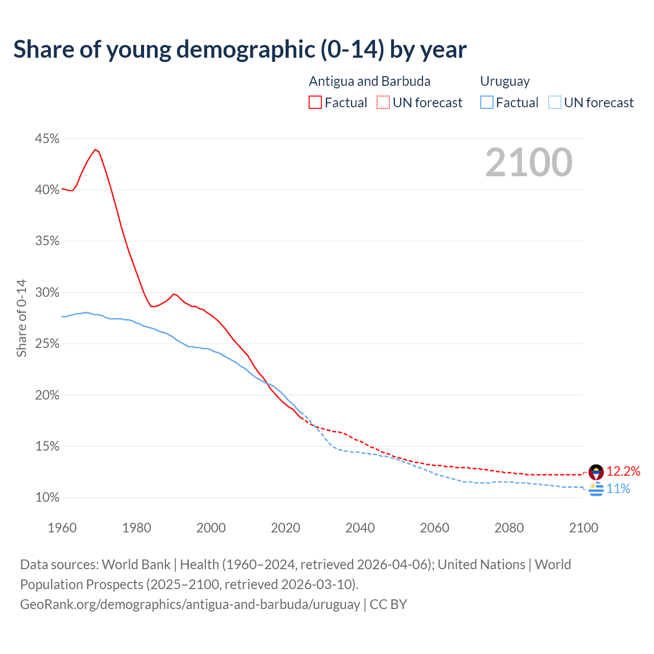 - The share of young demographic (0-15 years old) in Antigua and Barbuda is 17.8% vs 18.3% in Uruguay.
