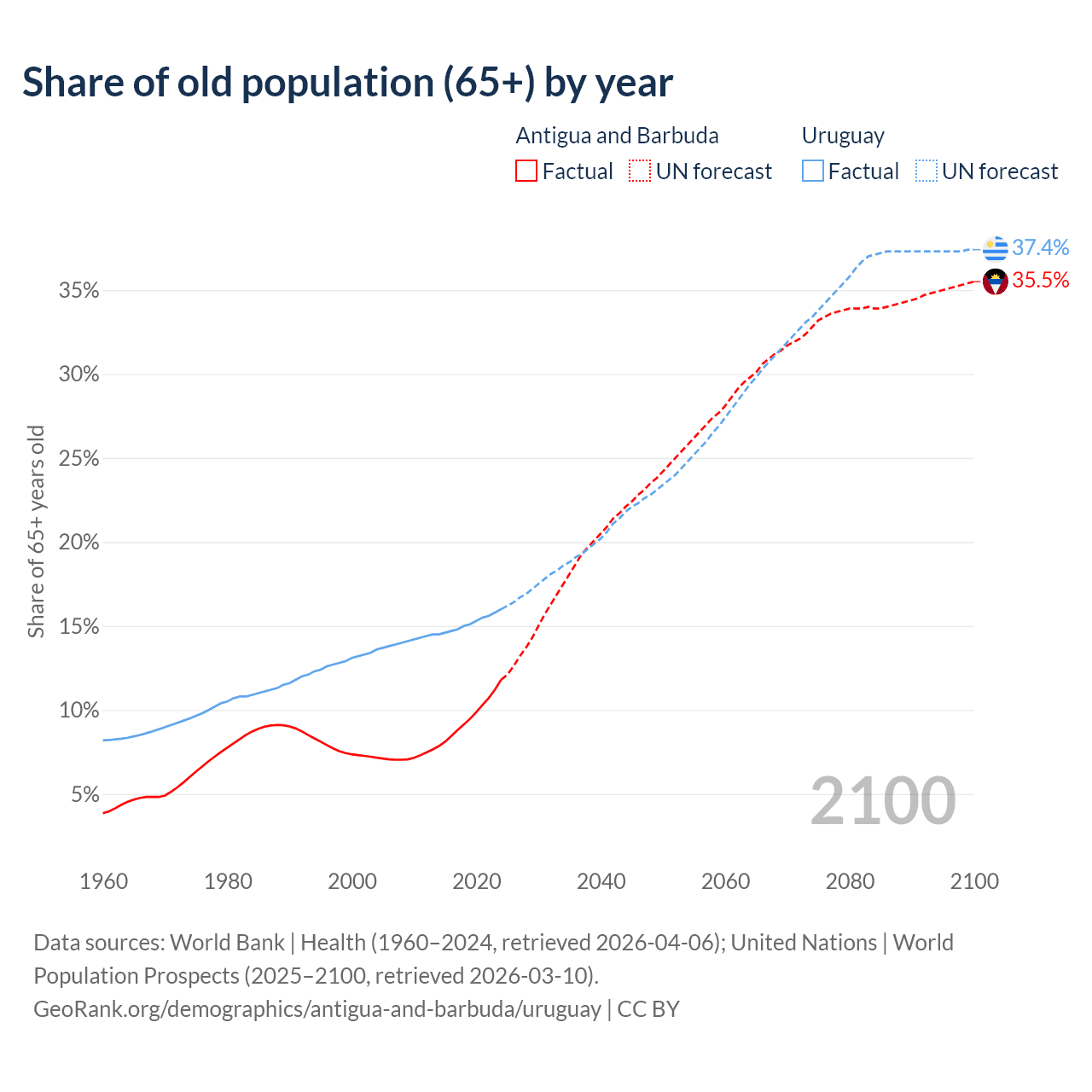 The share of older people aged 65 and over is 11.8% in Antigua and Barbuda and 16% in Uruguay. Life expectancy in Antigua and Barbuda compared to Uruguay .