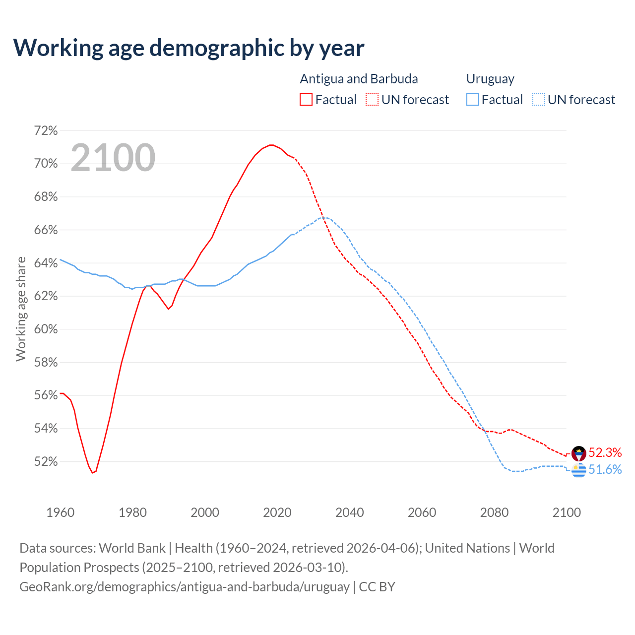 - Antigua and Barbuda has 66.7K working age adults (aged 15-64) vs 2.22M in Uruguay.