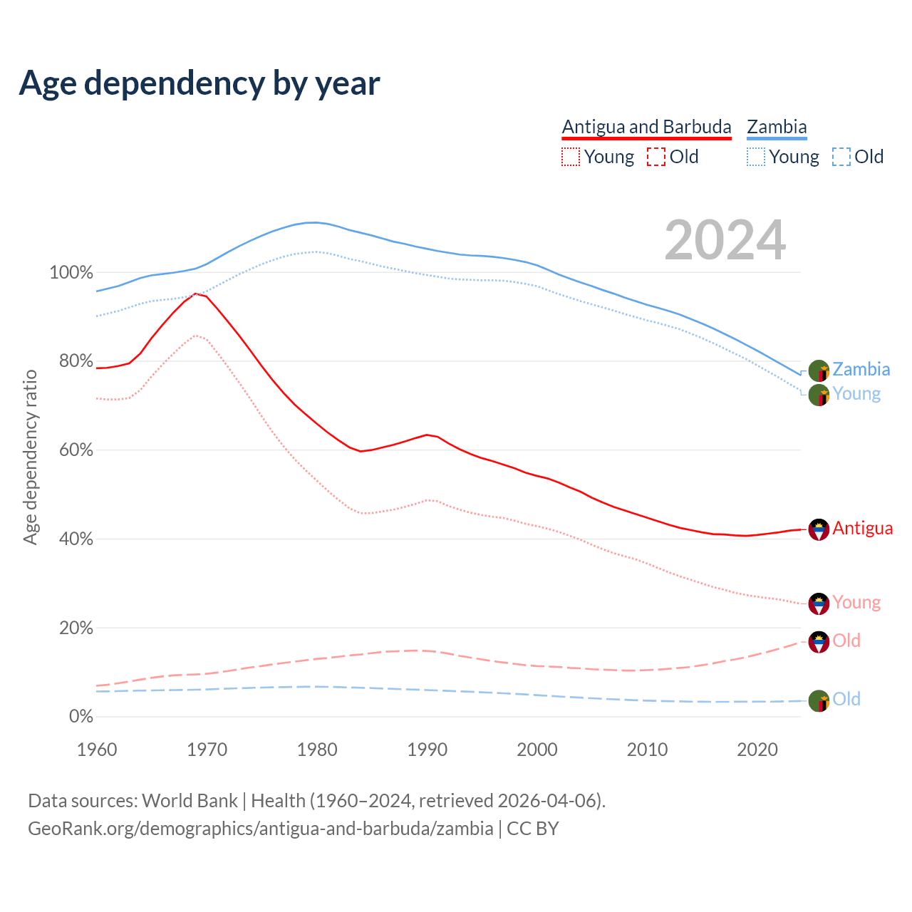 - Antigua and Barbuda is ranked 67/196 by median age (oldest to youngest) vs 182/196 for Zambia.