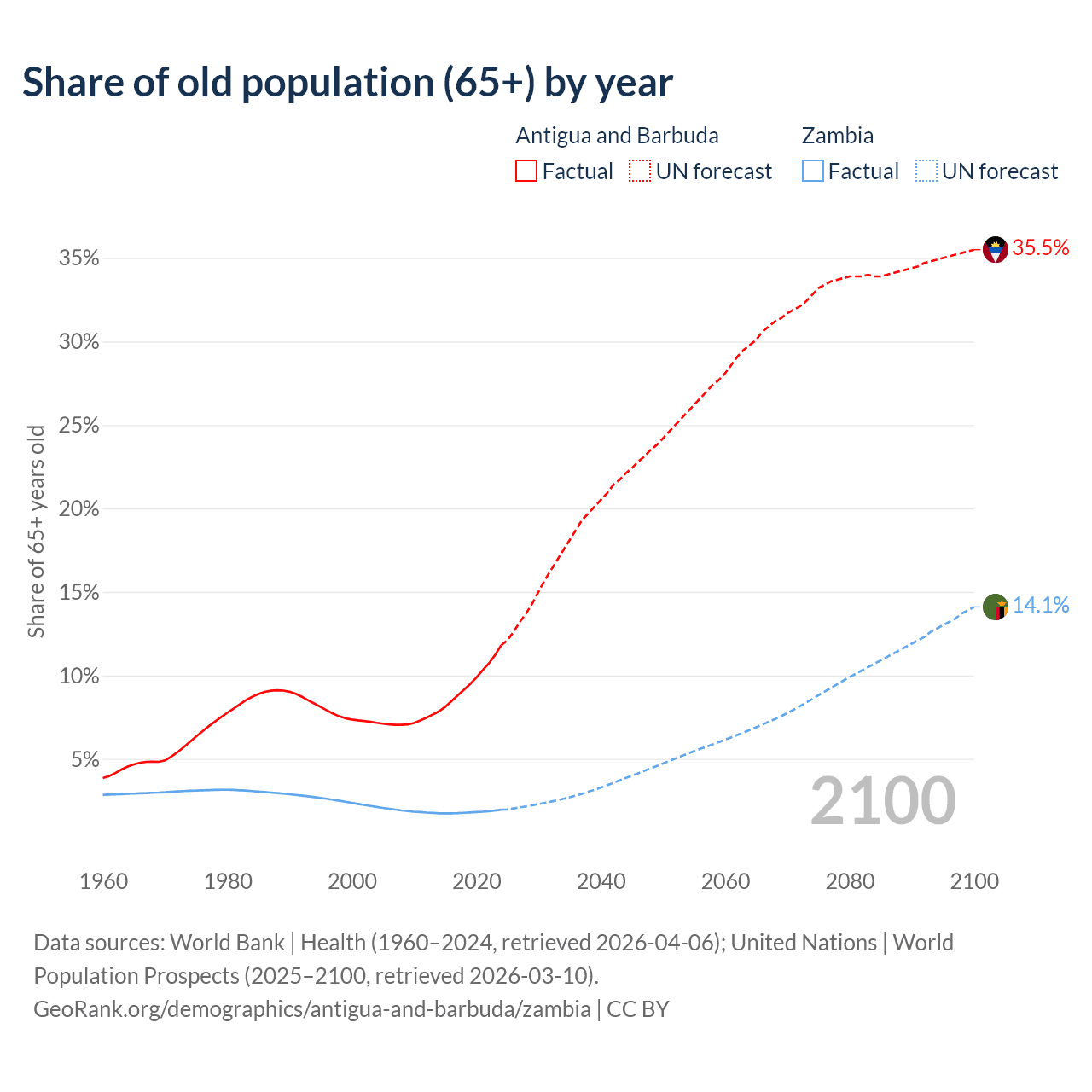 The share of older people aged 65 and over is 11.8% in Antigua and Barbuda and 1.95% in Zambia. Life expectancy in Antigua and Barbuda compared to Zambia .