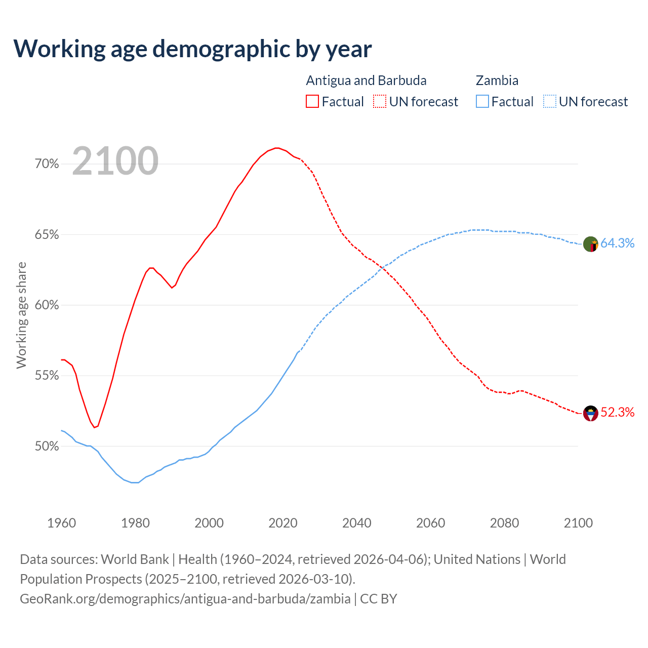 - Antigua and Barbuda has 66.7K working age adults (aged 15-64) vs 12.8M in Zambia.