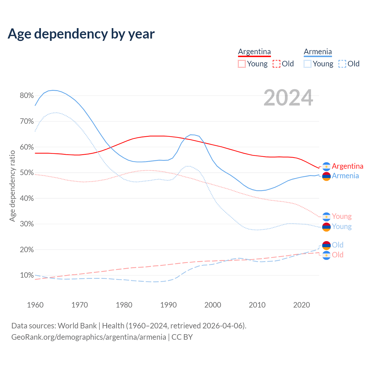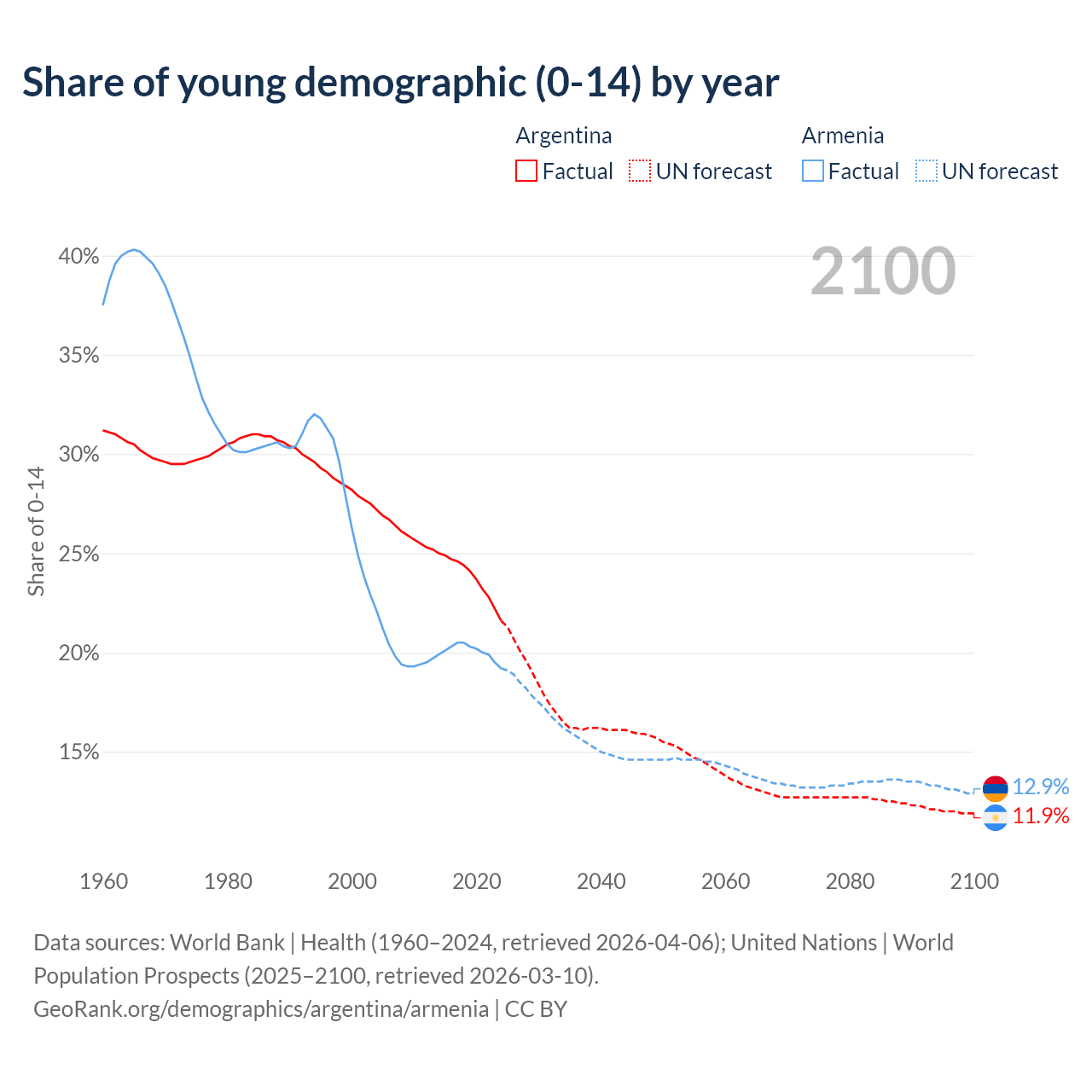 - The share of young demographic (0-15 years old) in Argentina is 21.6% vs 19.2% in Armenia.