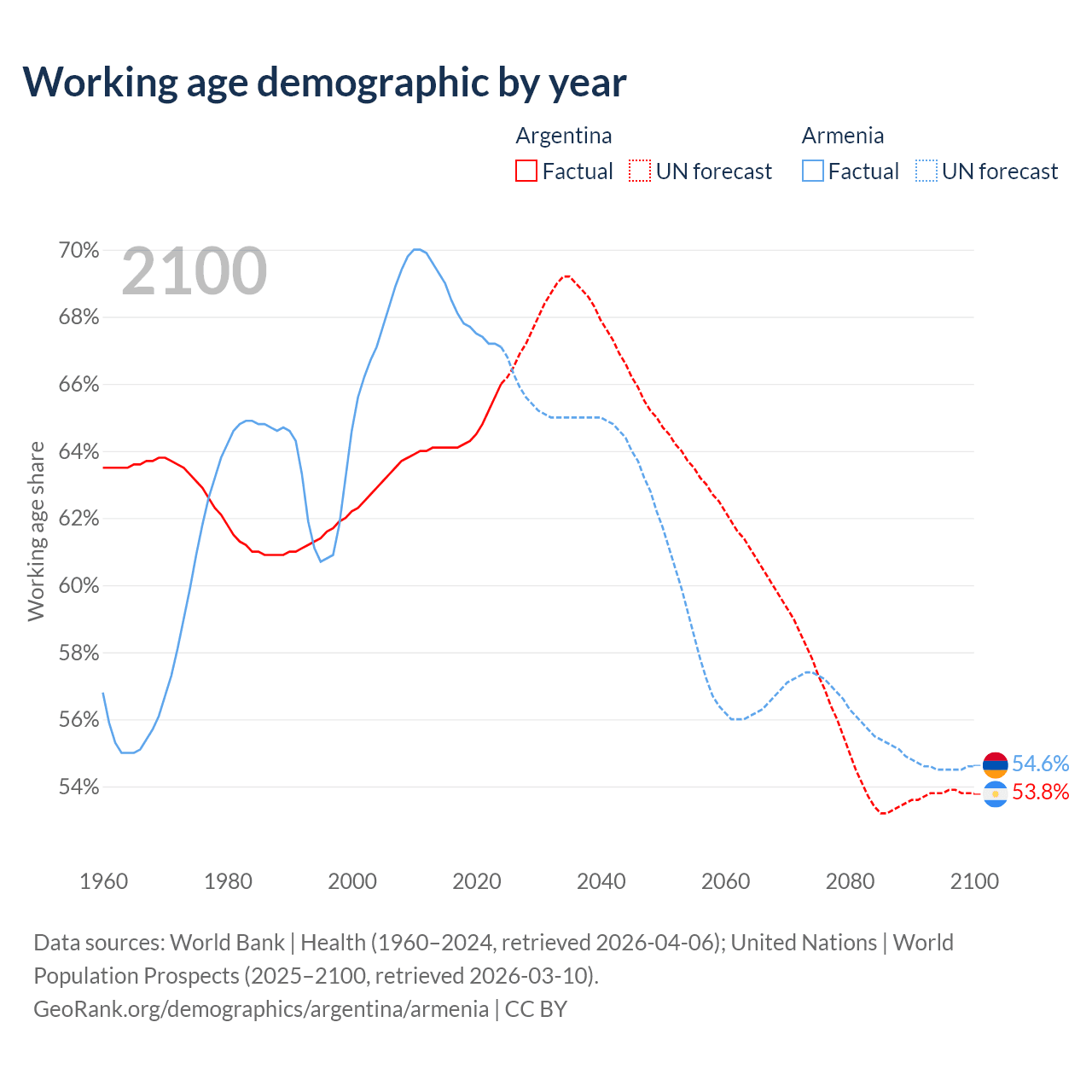 Median age Argentina vs Armenia, 1960-2100