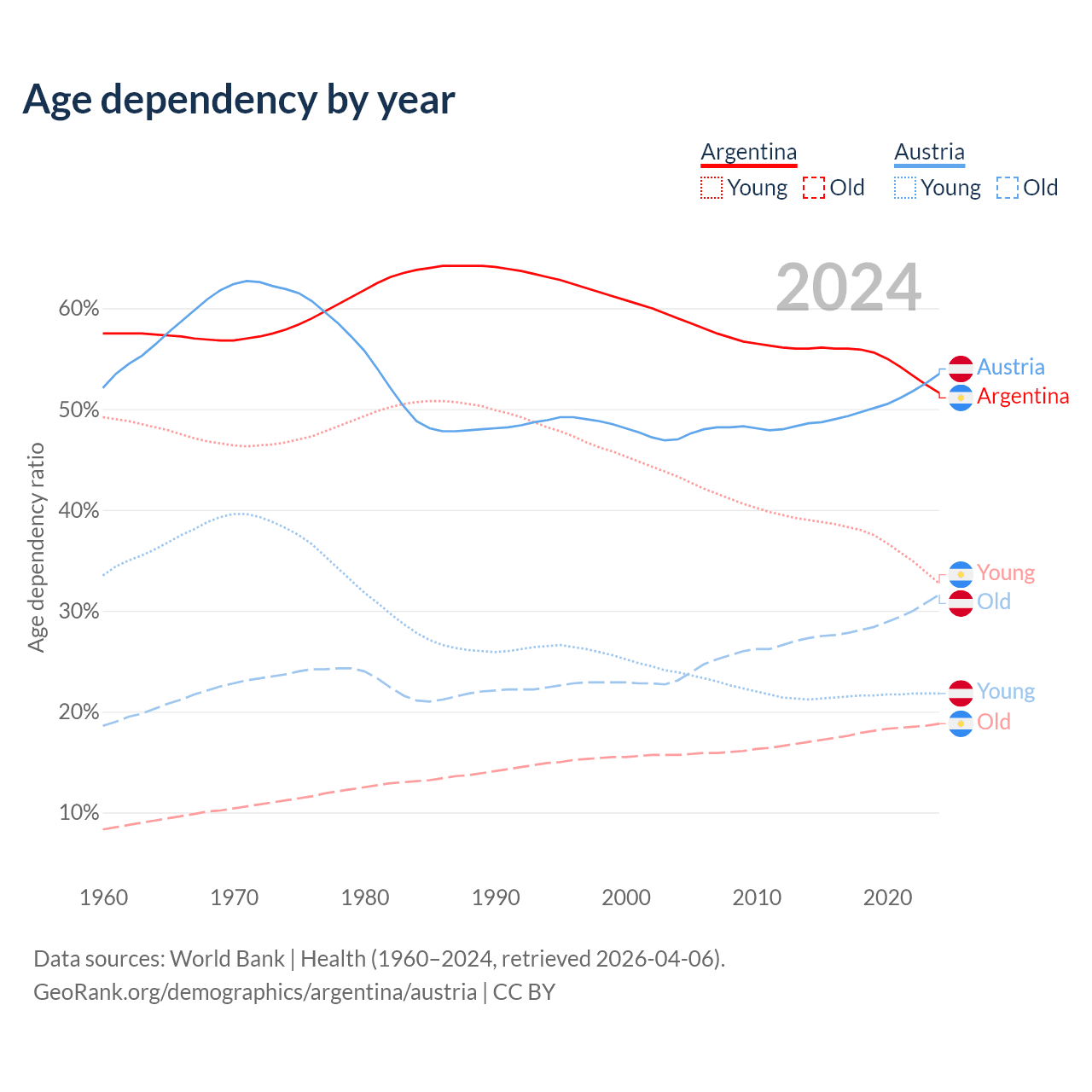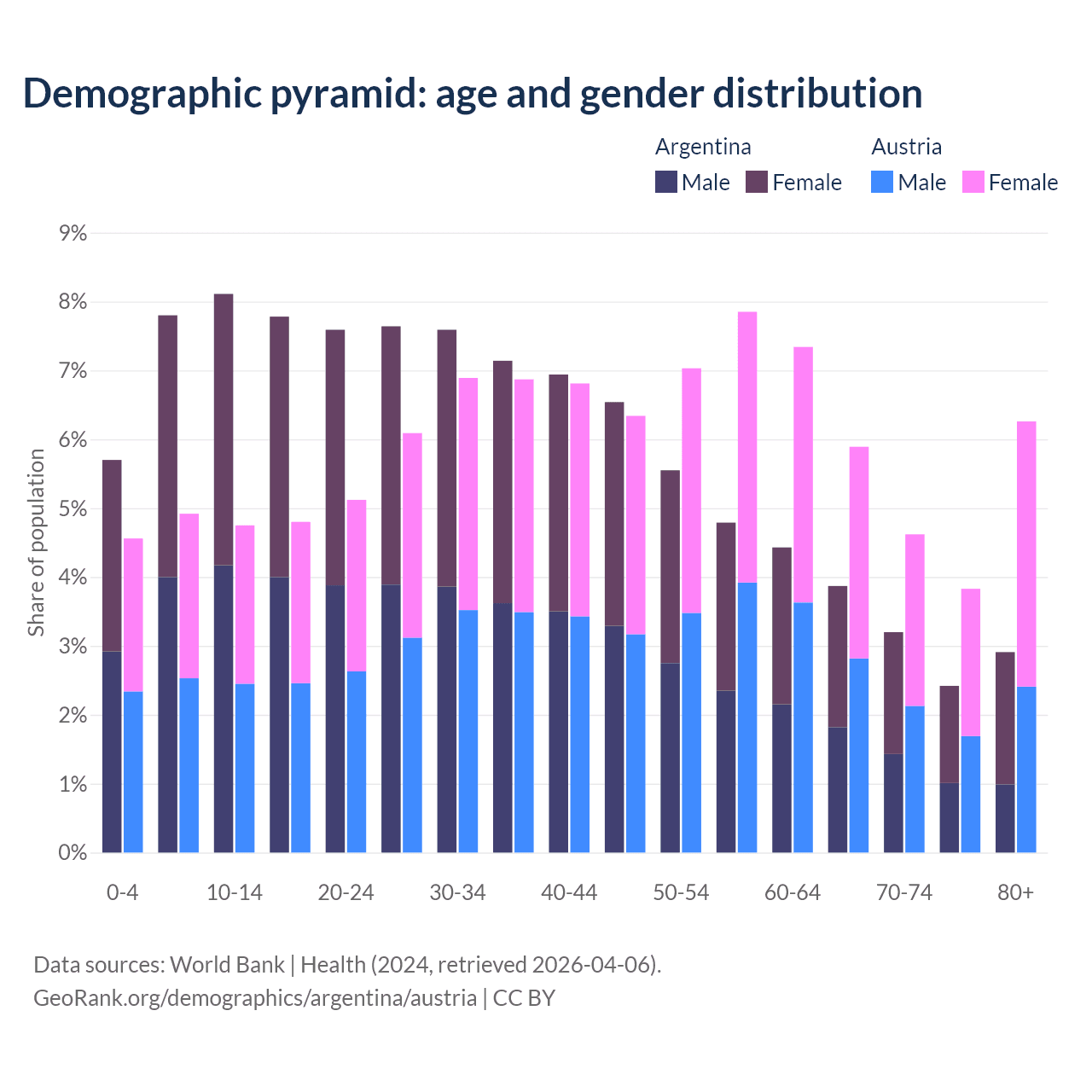 - Argentina is ranked 85/196 by median age (oldest to youngest) vs 19/196 for Austria.