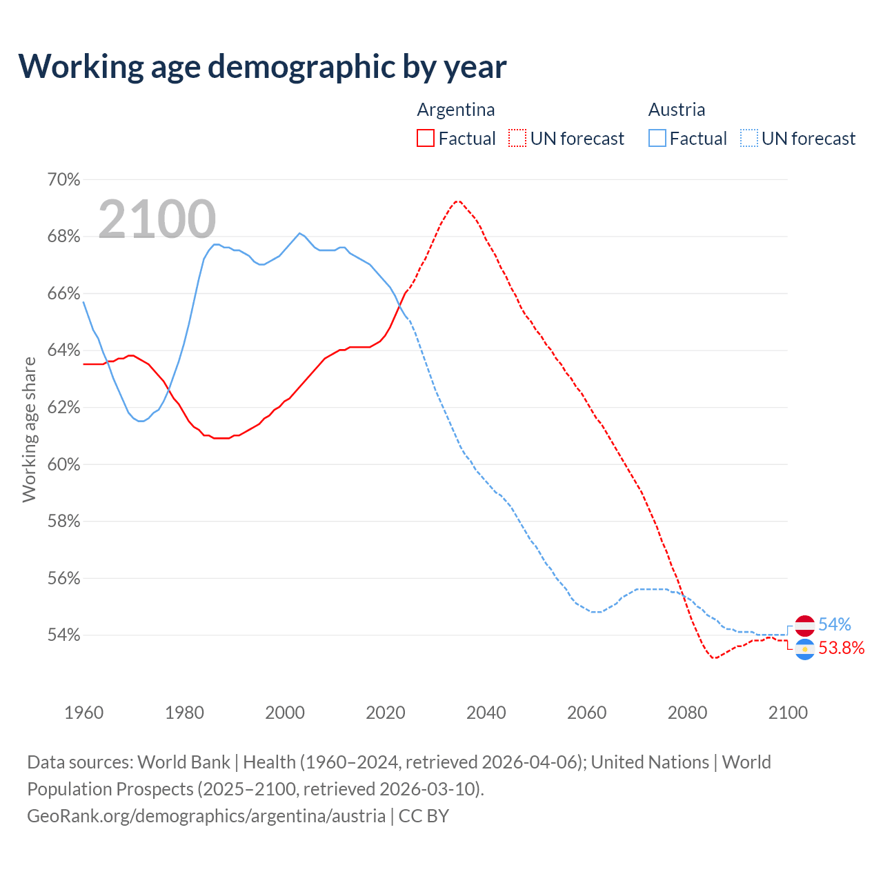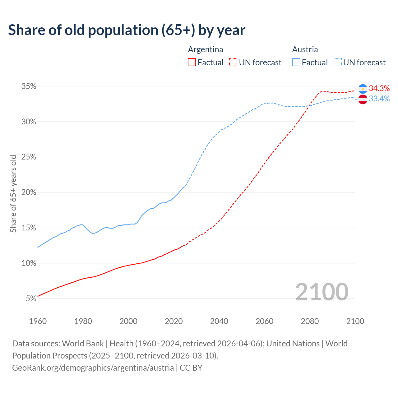 Median age Argentina vs Austria, 1960-2100