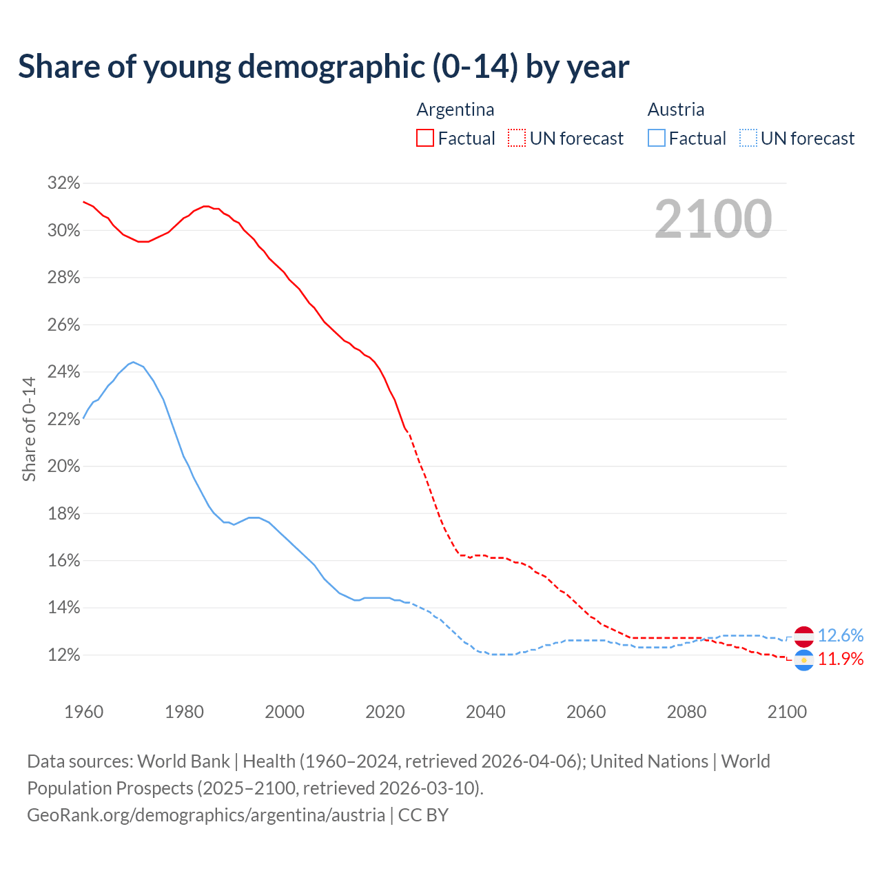 - The share of young demographic (0-15 years old) in Argentina is 21.6% vs 14.2% in Austria.