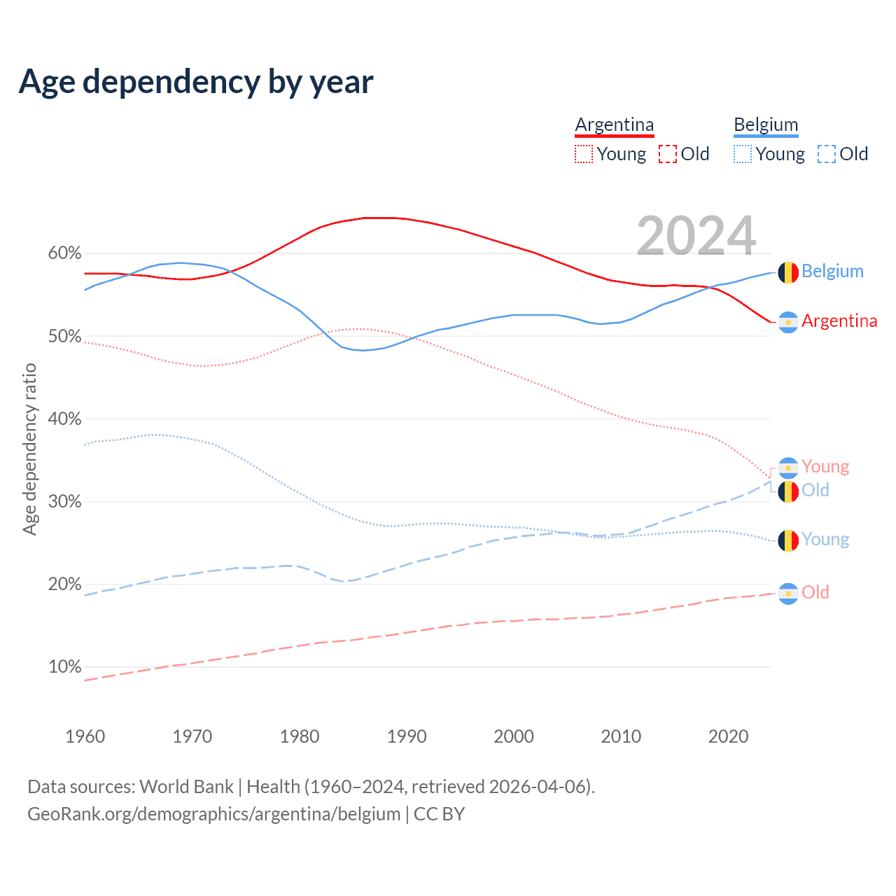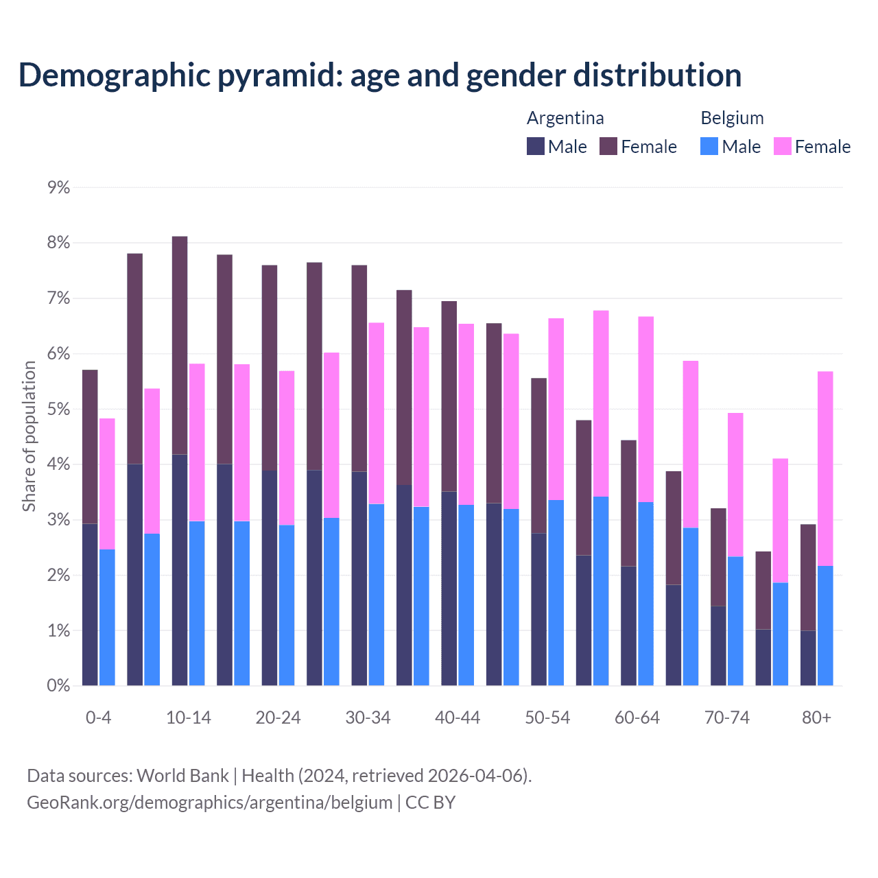 - Argentina is ranked 85/196 by median age (oldest to youngest) vs 32/196 for Belgium.