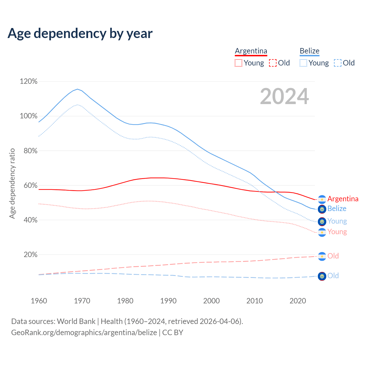 - Argentina is ranked 85/196 by median age (oldest to youngest) vs 120/196 for Belize.