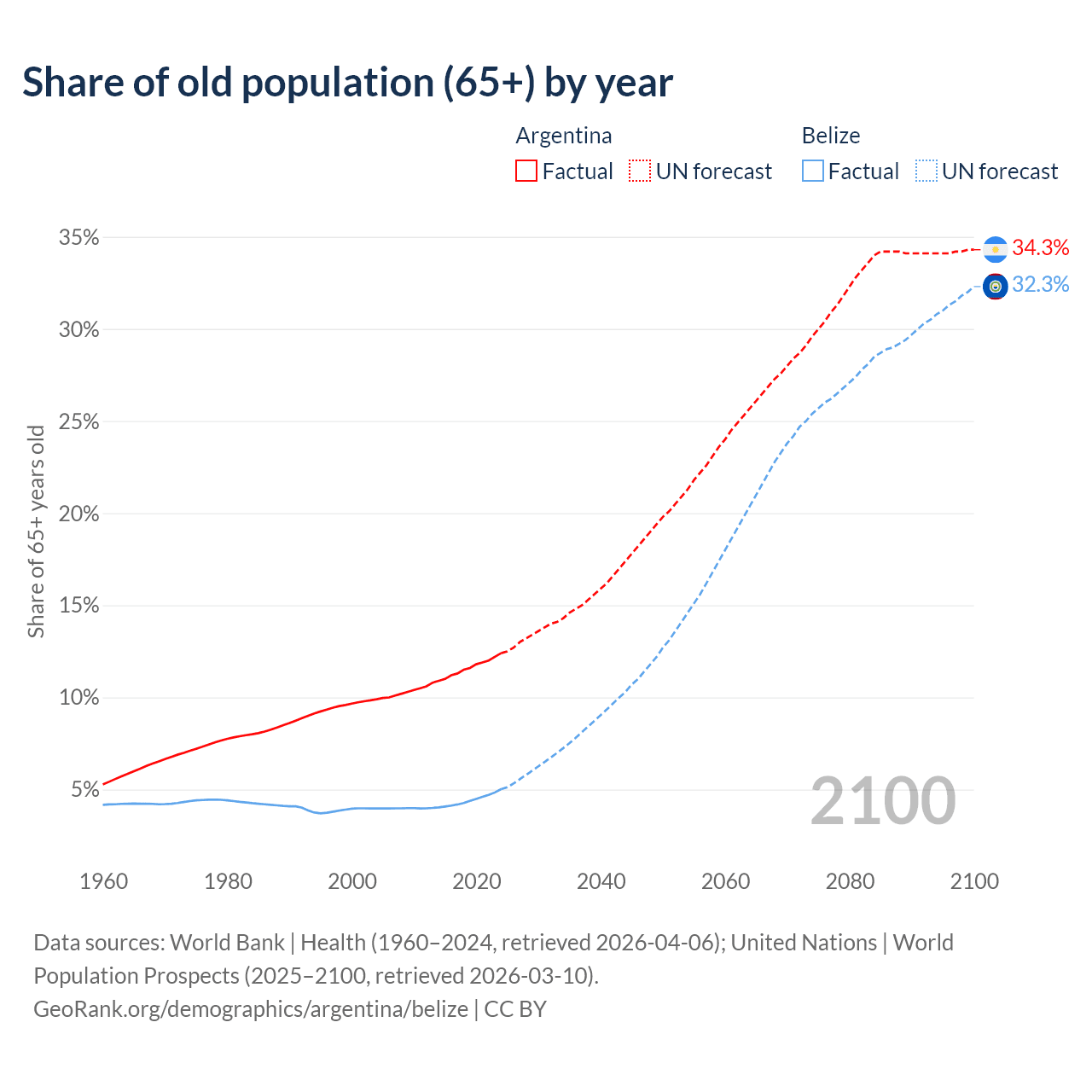 The share of older people aged 65 and over is 12.4% in Argentina and 5.02% in Belize. Life expectancy in Argentina compared to Belize .