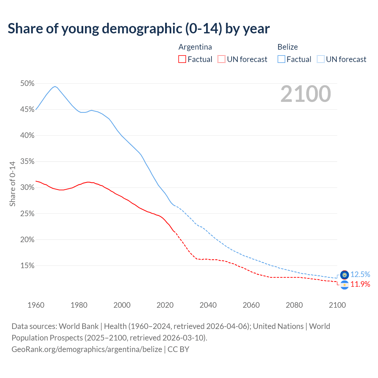 - The share of young demographic (0-15 years old) in Argentina is 21.6% vs 26.6% in Belize.