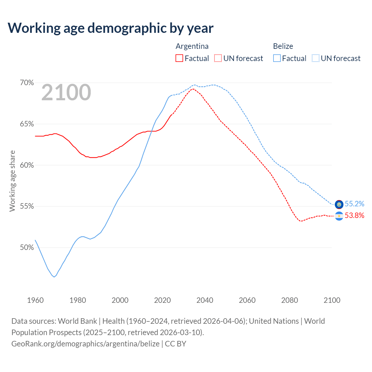 - Argentina has 30.4M working age adults (aged 15-64) vs 294K in Belize.
