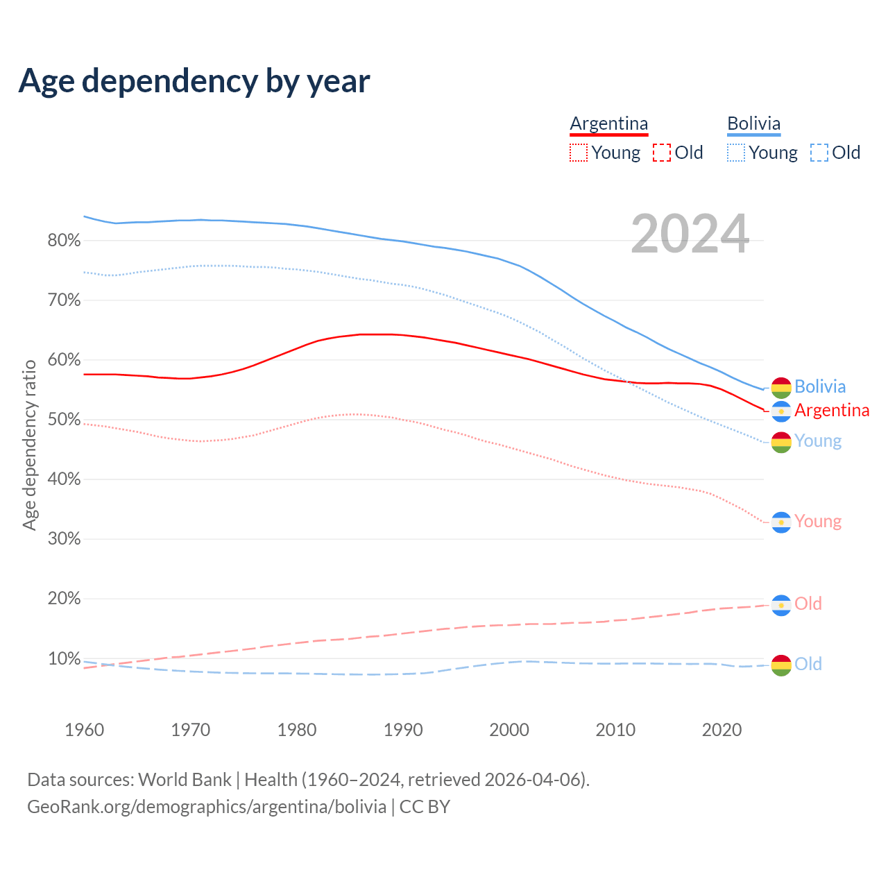 - The share of old-age demographic (65+) in Argentina is 12.4% vs 5.64% in Bolivia.