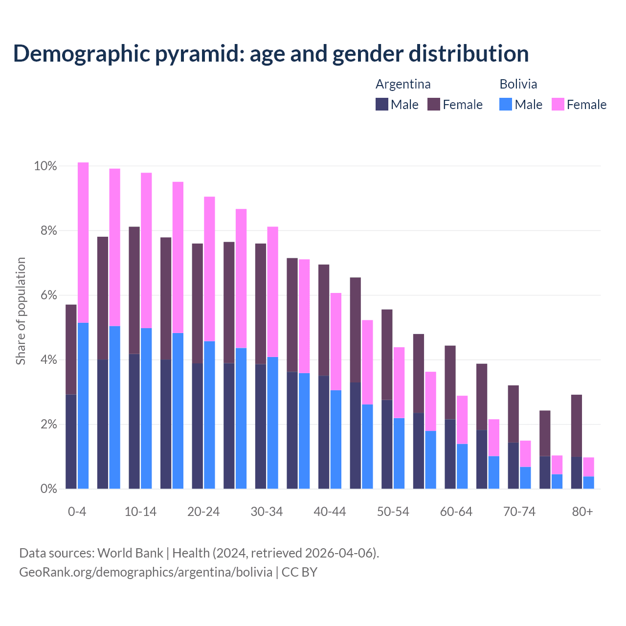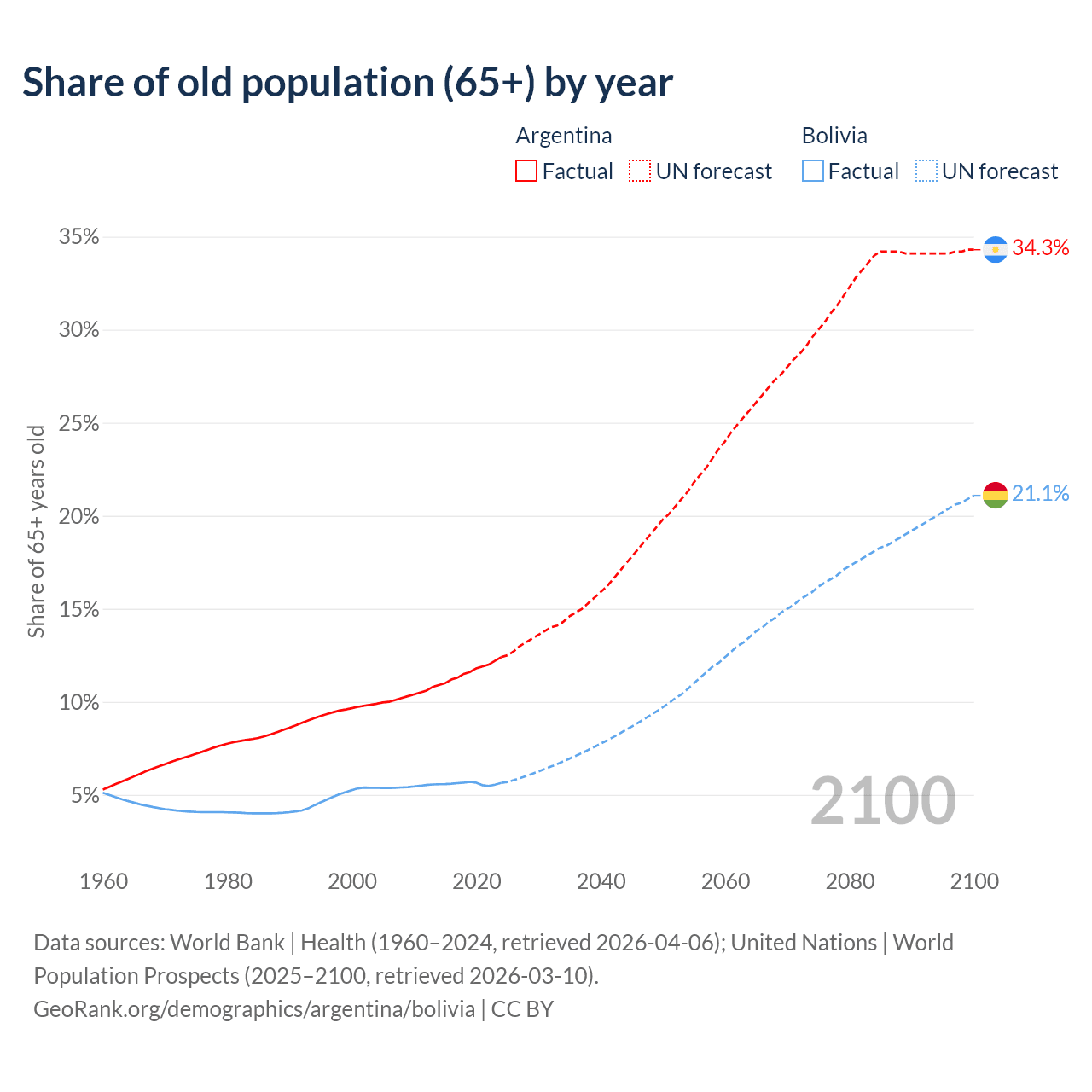 The share of older people aged 65 and over is 12.4% in Argentina and 5.64% in Bolivia. Life expectancy in Argentina compared to Bolivia .