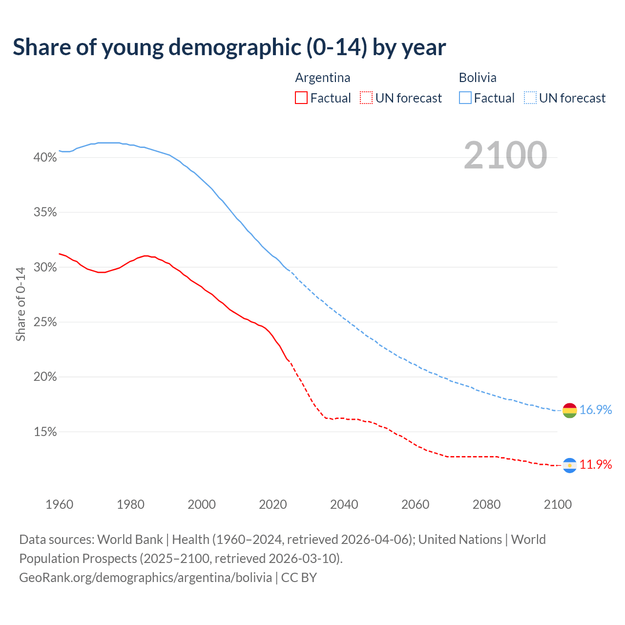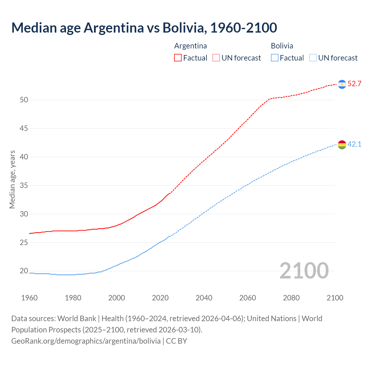 Median age Argentina vs Bolivia, 1960-2100
