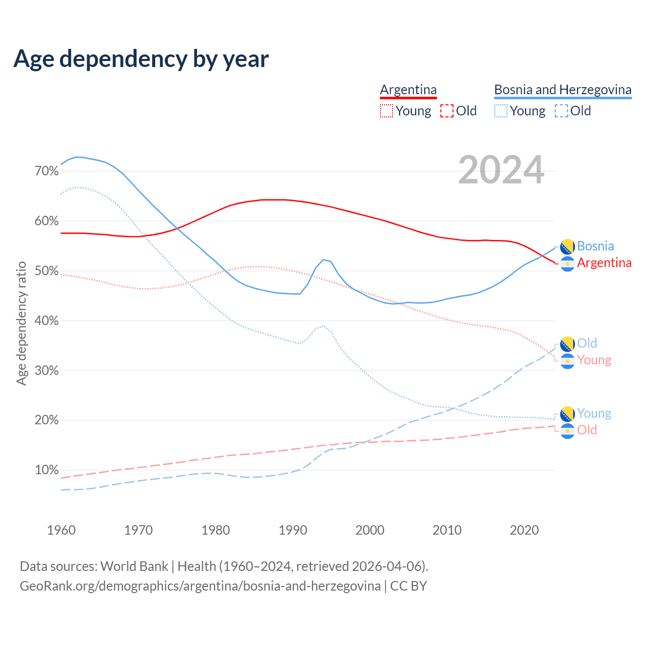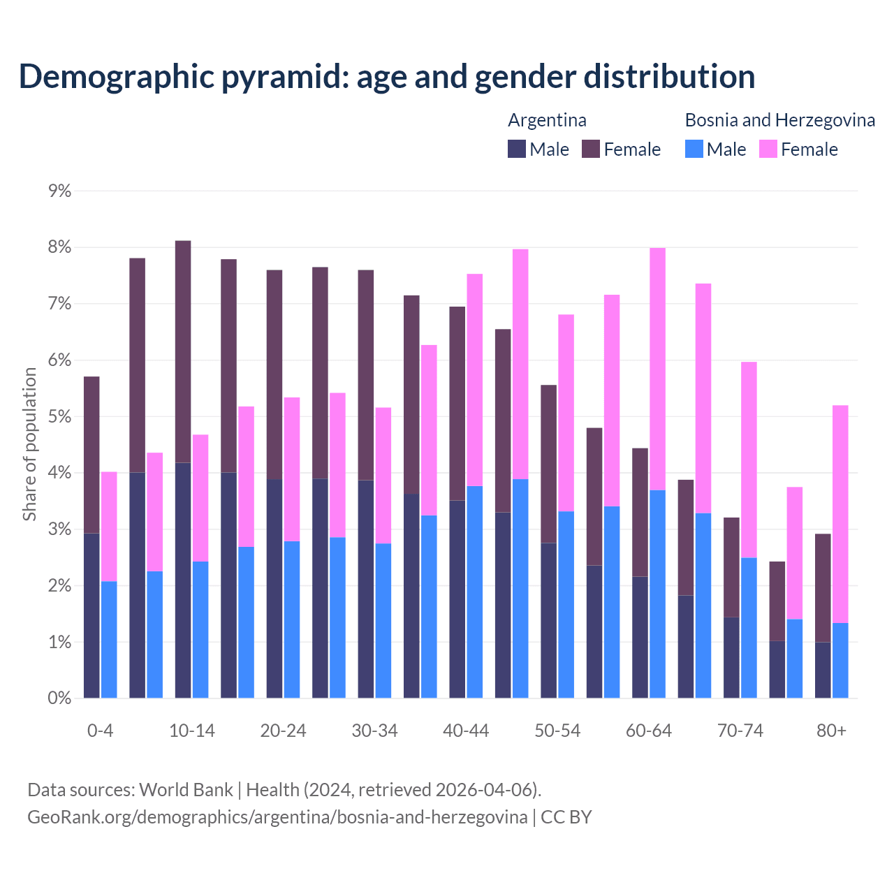 - Argentina is ranked 85/196 by median age (oldest to youngest) vs 8/196 for Bosnia and Herzegovina.