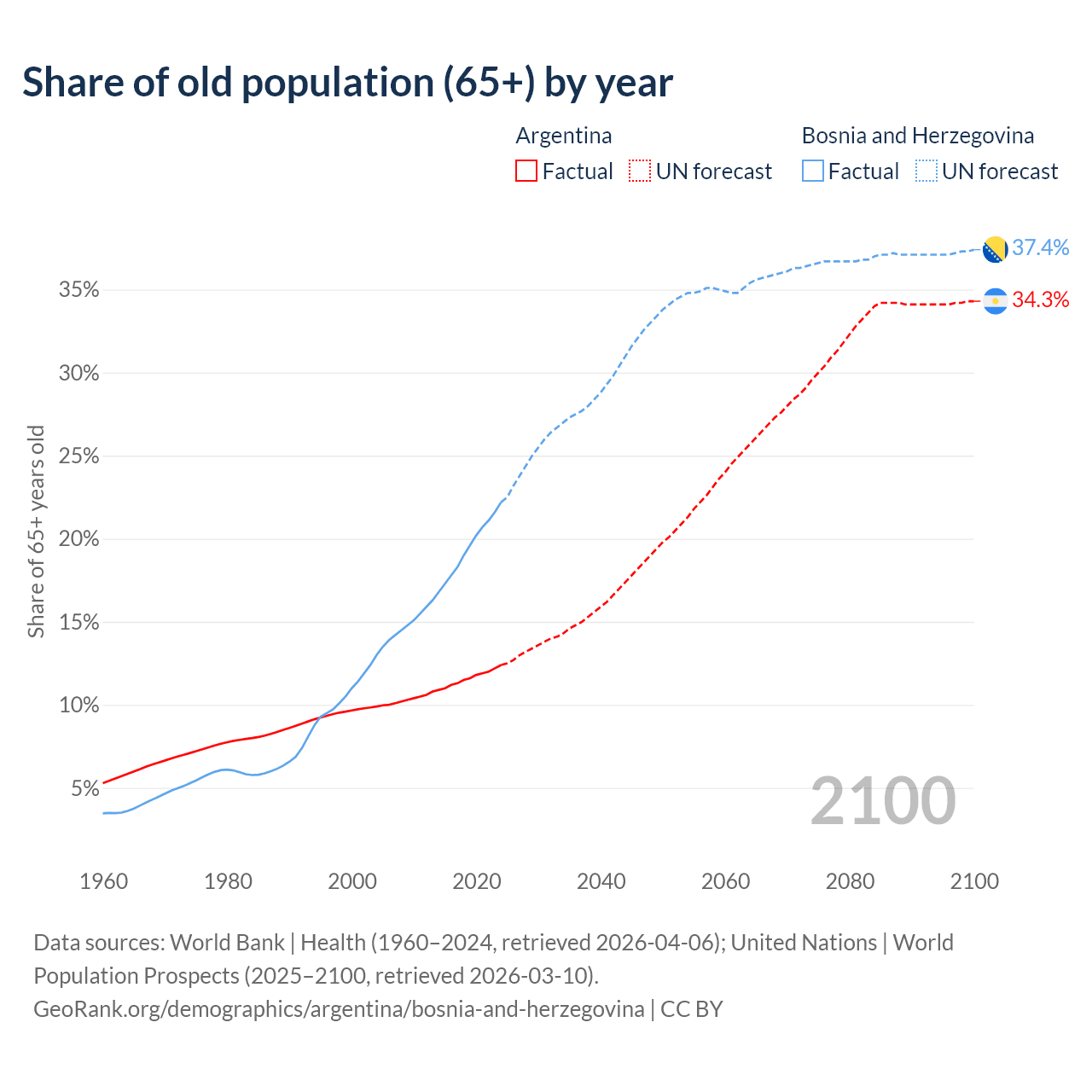 The share of older people aged 65 and over is 12.4% in Argentina and 22.2% in Bosnia and Herzegovina. Life expectancy in Argentina compared to Bosnia and Herzegovina .