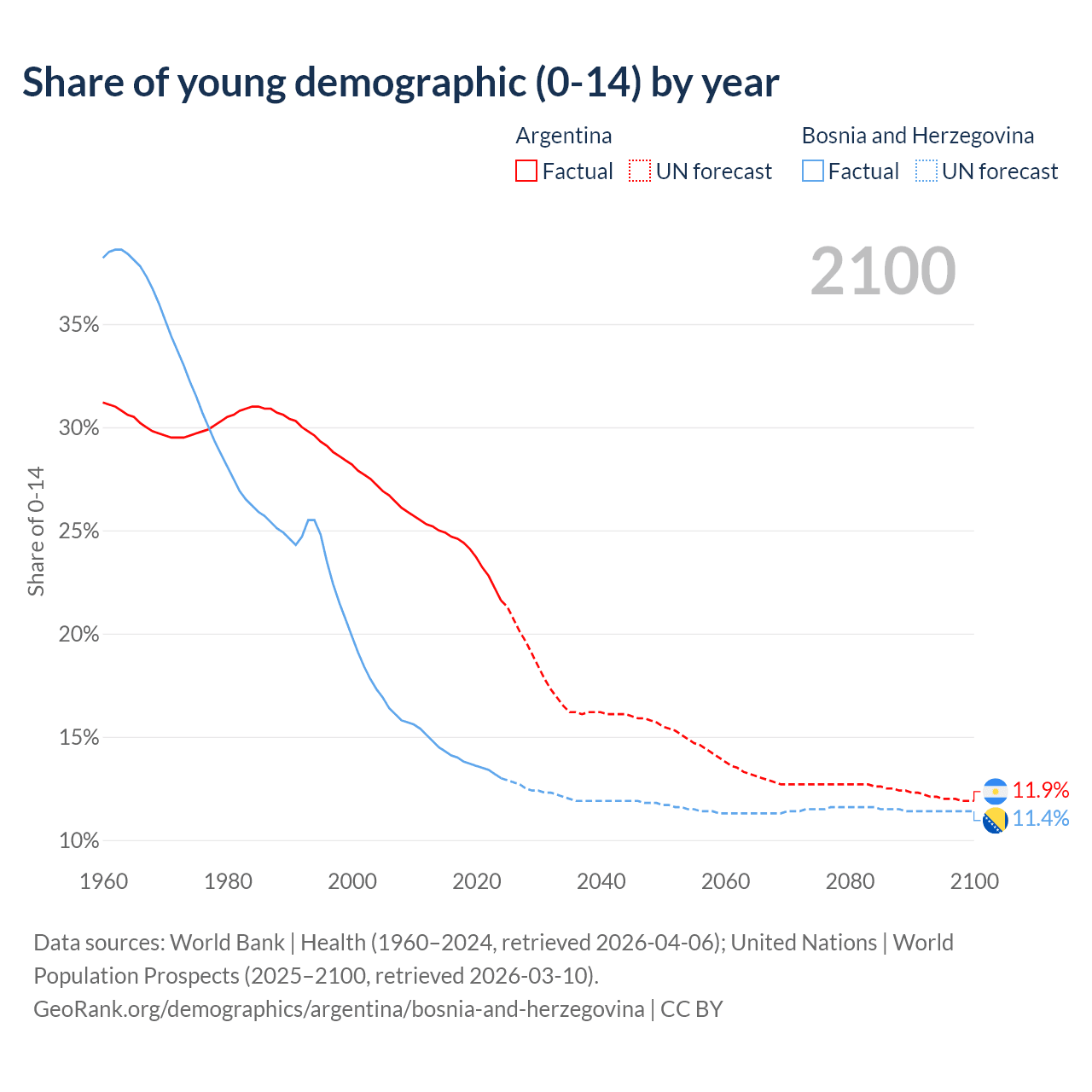 - The share of young demographic (0-15 years old) in Argentina is 21.6% vs 13% in Bosnia and Herzegovina.
