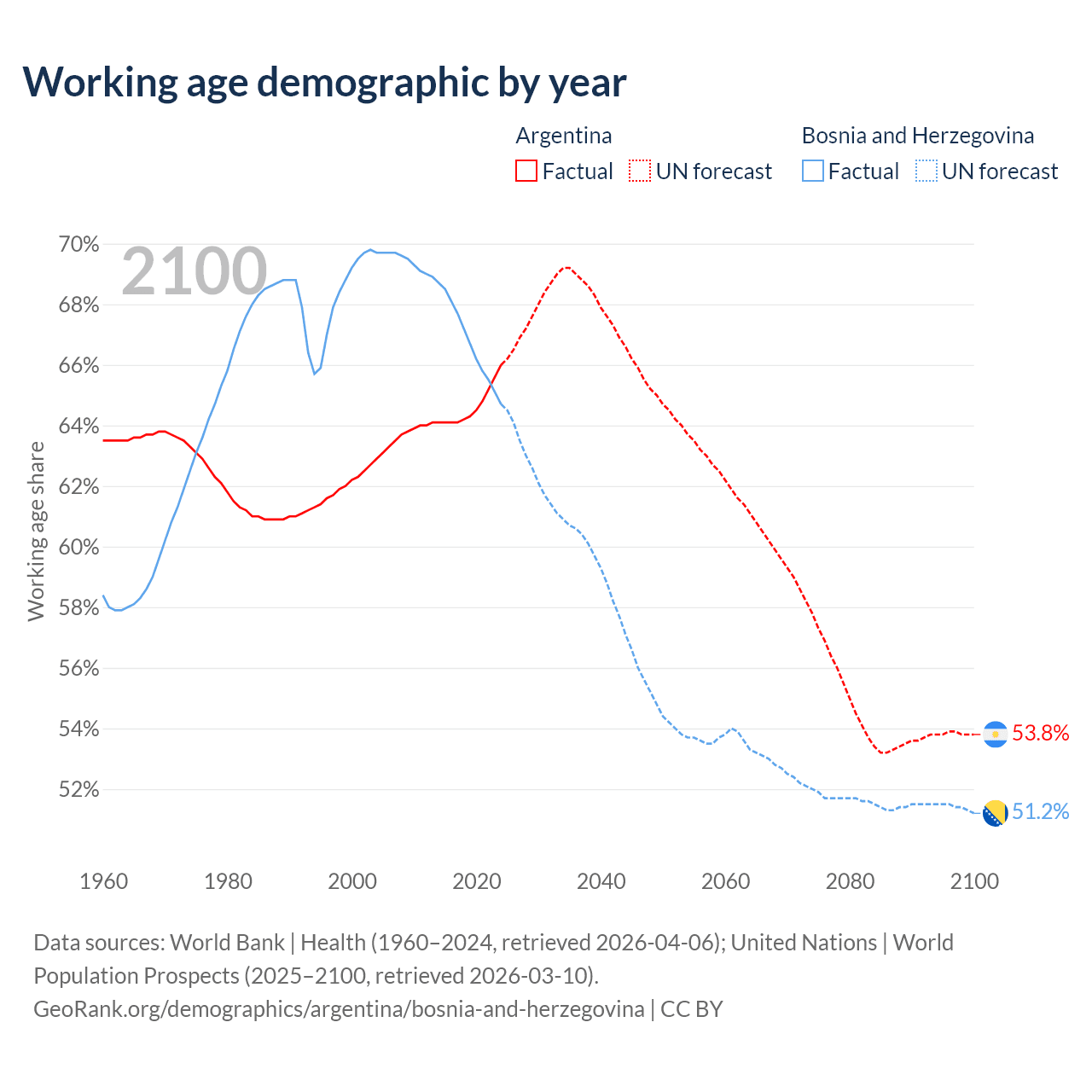 - Argentina has 30.4M working age adults (aged 15-64) vs 2.02M in Bosnia and Herzegovina.