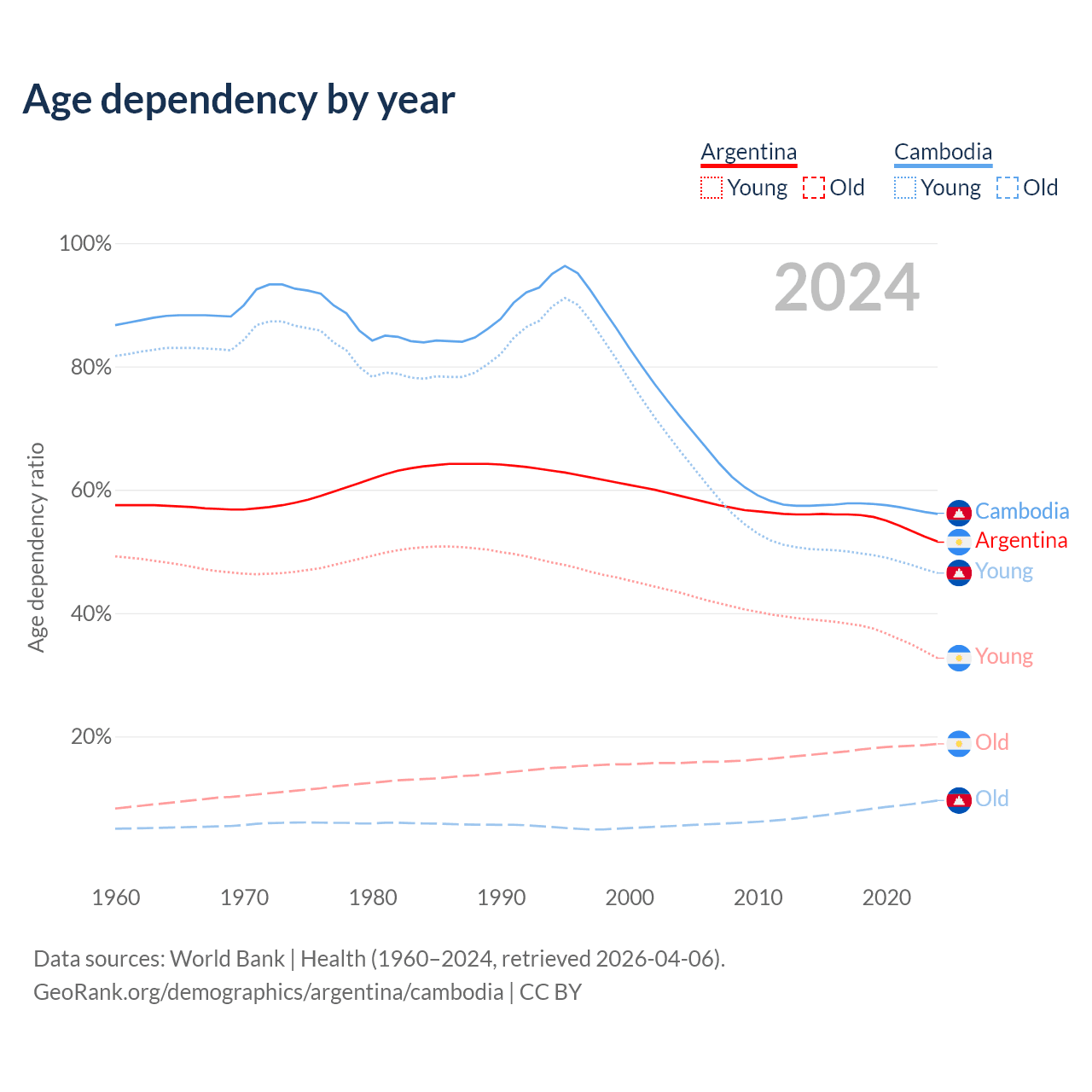 - Argentina is ranked 85/196 by median age (oldest to youngest) vs 121/196 for Cambodia.