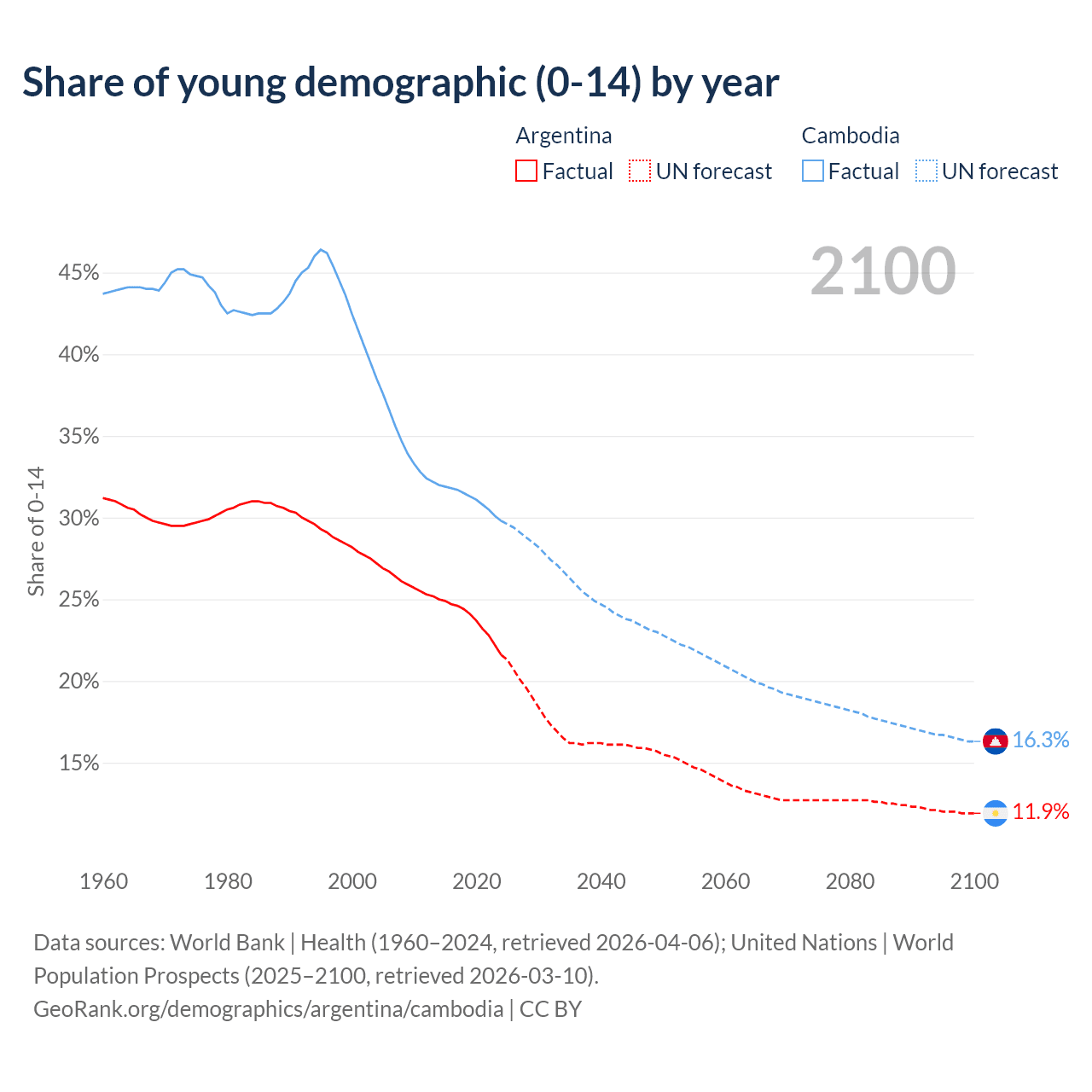 - The share of young demographic (0-15 years old) in Argentina is 21.6% vs 29.8% in Cambodia.