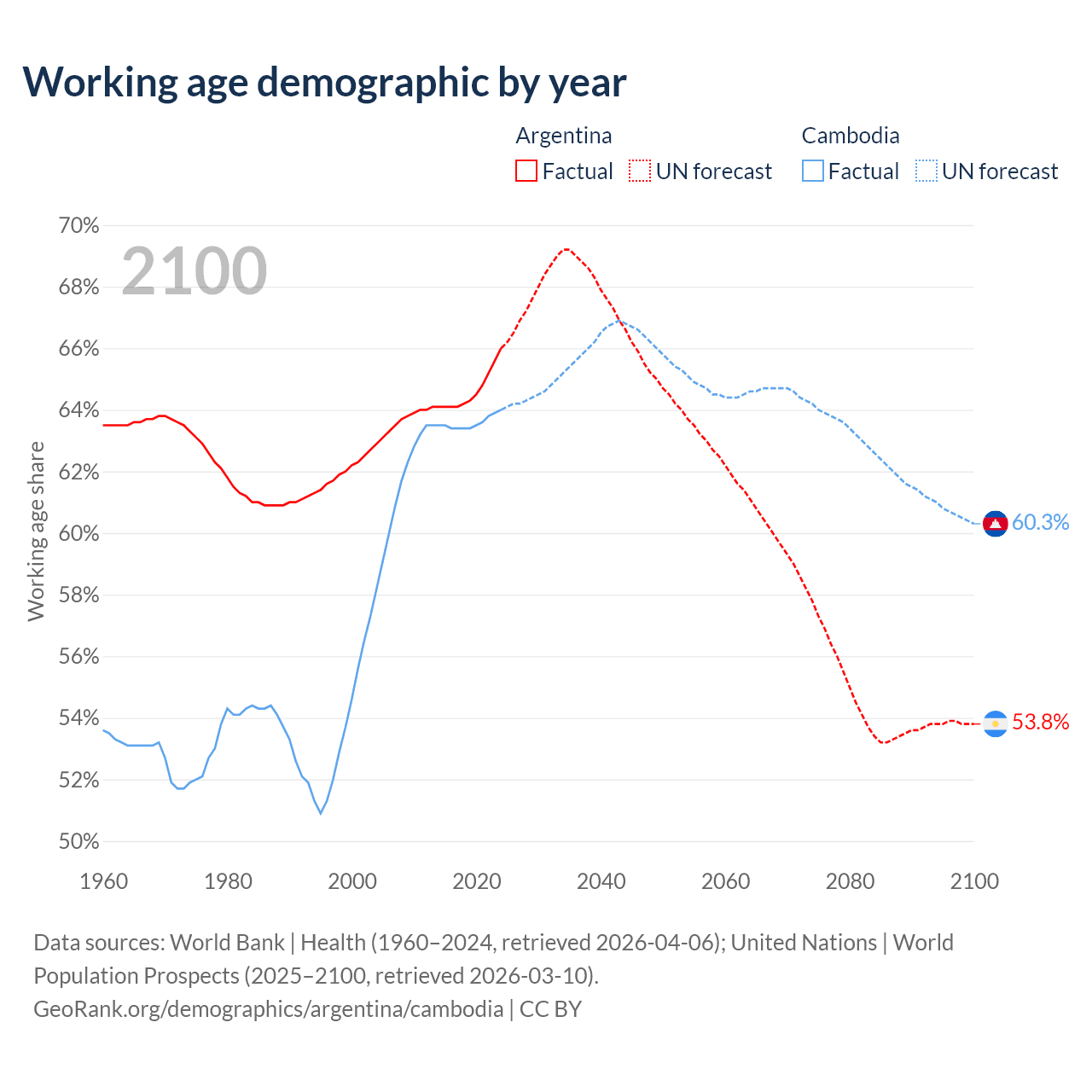Median age Argentina vs Cambodia, 1960-2100