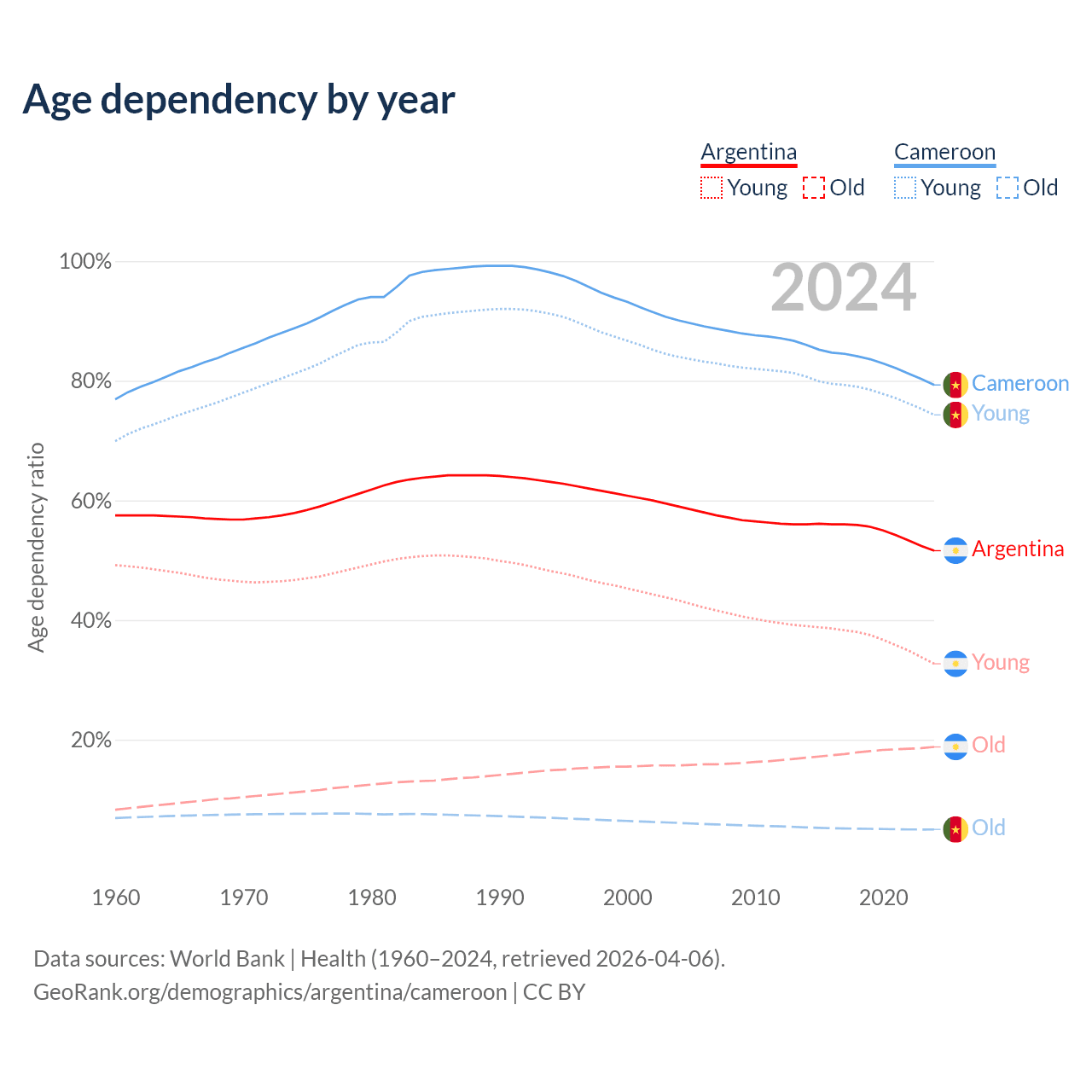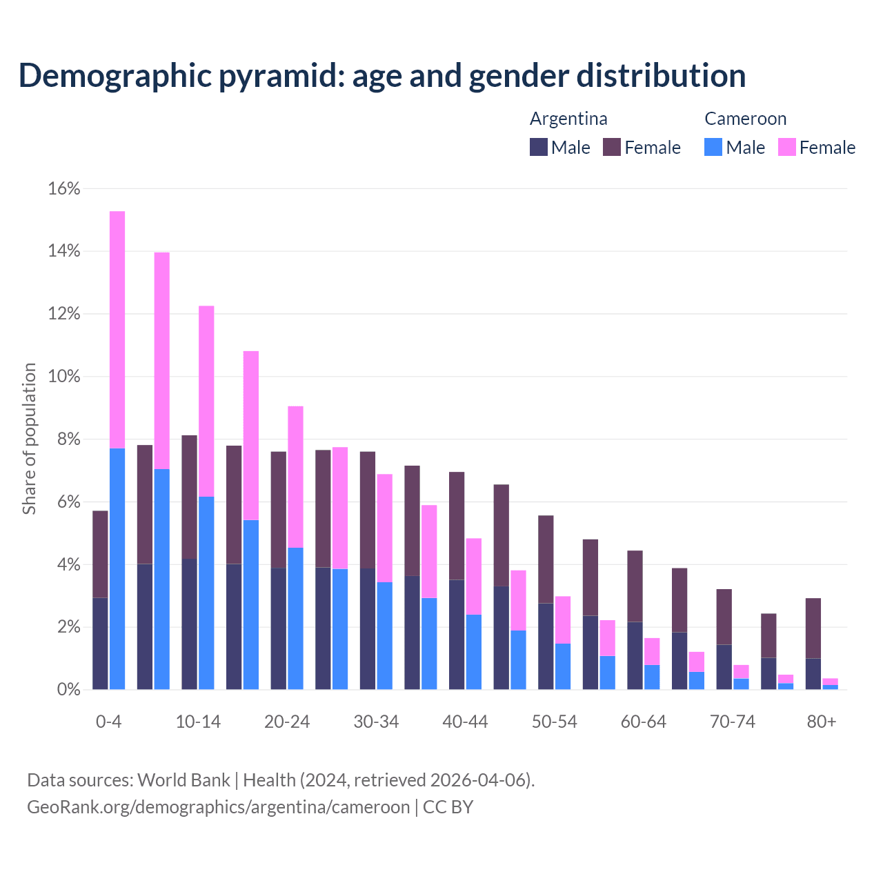 - Argentina is ranked 85/196 by median age (oldest to youngest) vs 180/196 for Cameroon.