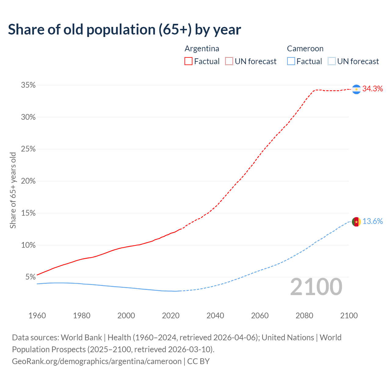 The share of older people aged 65 and over is 12.4% in Argentina and 2.79% in Cameroon. Life expectancy in Argentina compared to Cameroon .