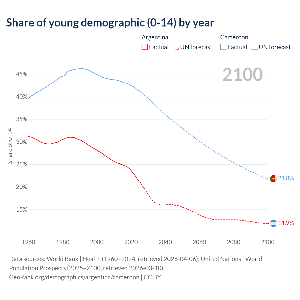 - The share of young demographic (0-15 years old) in Argentina is 21.6% vs 41.4% in Cameroon.
