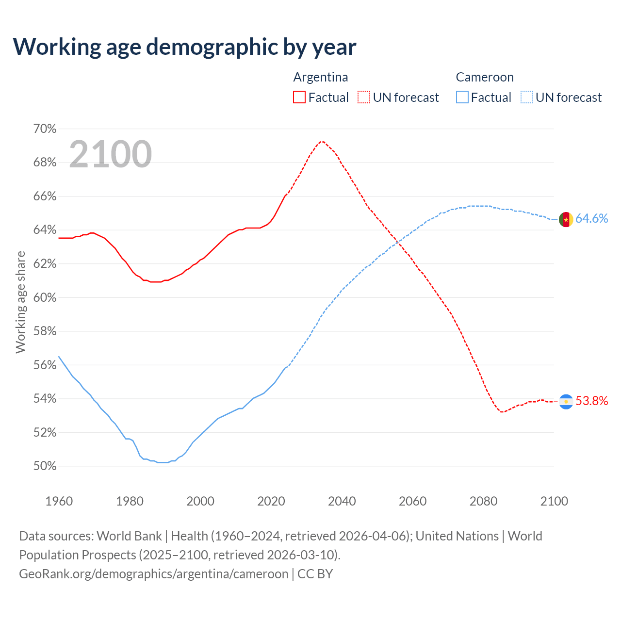 - Argentina has 30.4M working age adults (aged 15-64) vs 17.2M in Cameroon.