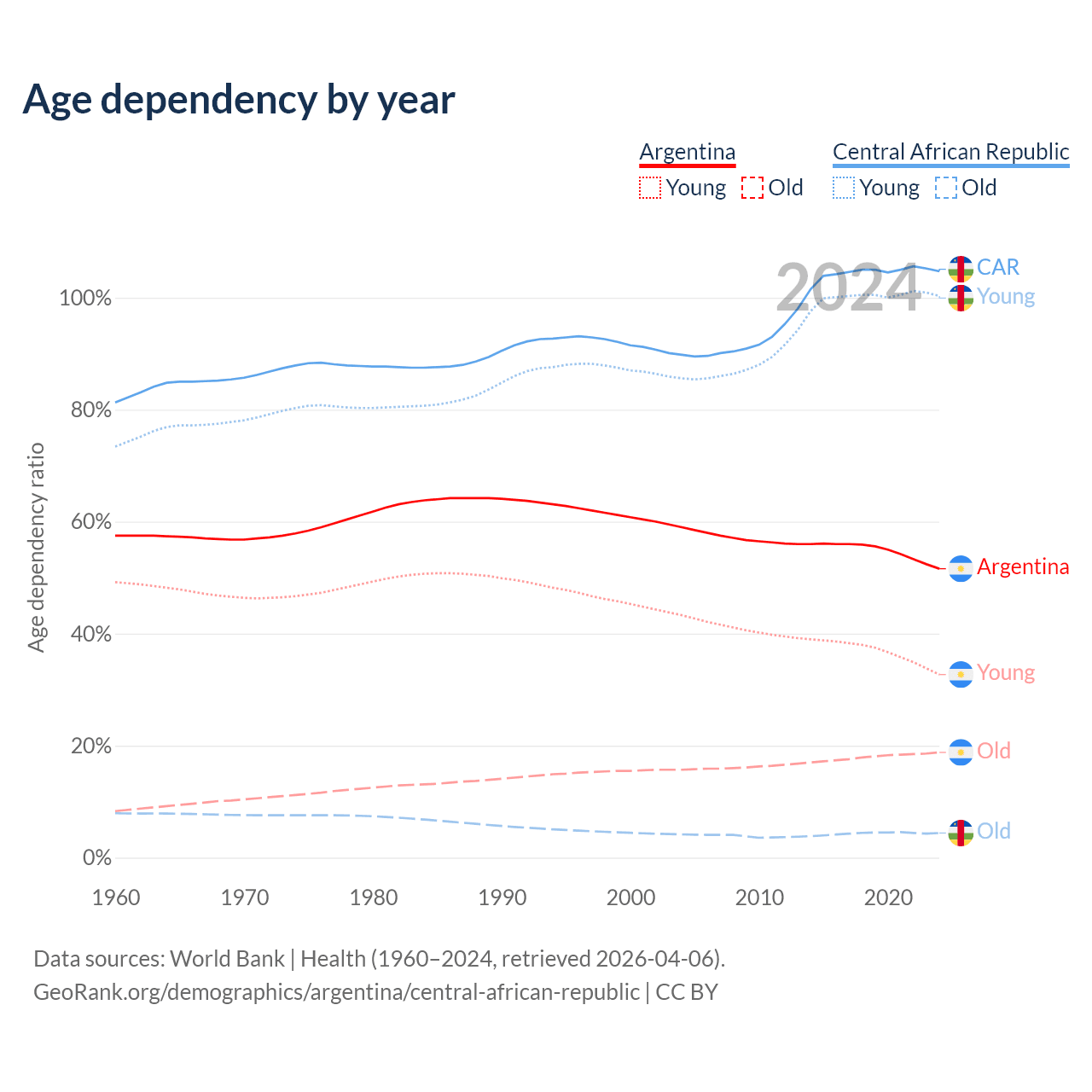 Data sources: World Bank | Health (1960–2024, retrieved 2026-04-06); U.S. Census Bureau (1960–2024, retrieved 2026-02-08).