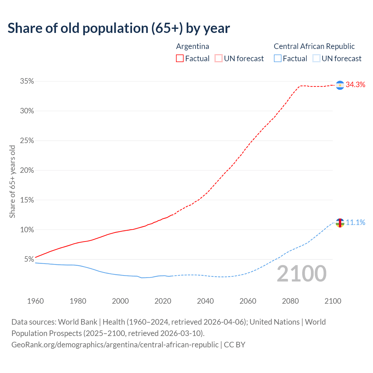 The share of older people aged 65 and over is 12.4% in Argentina and 2.15% in the Central African Republic. Life expectancy in Argentina compared to the Central African Republic .