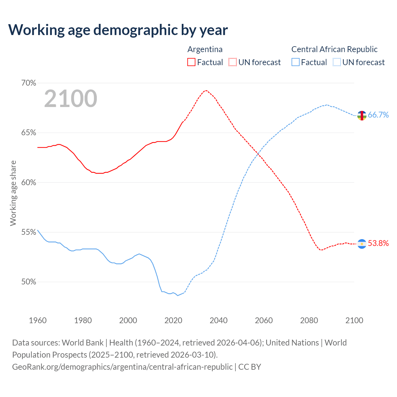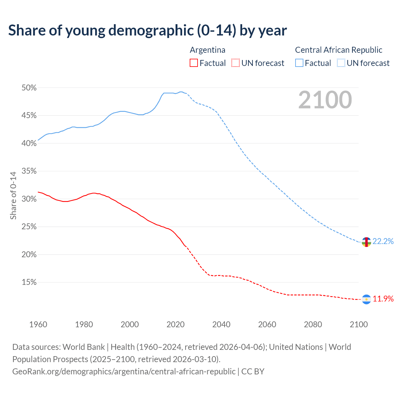 Median age Argentina vs Central African Republic, 1960-2100
