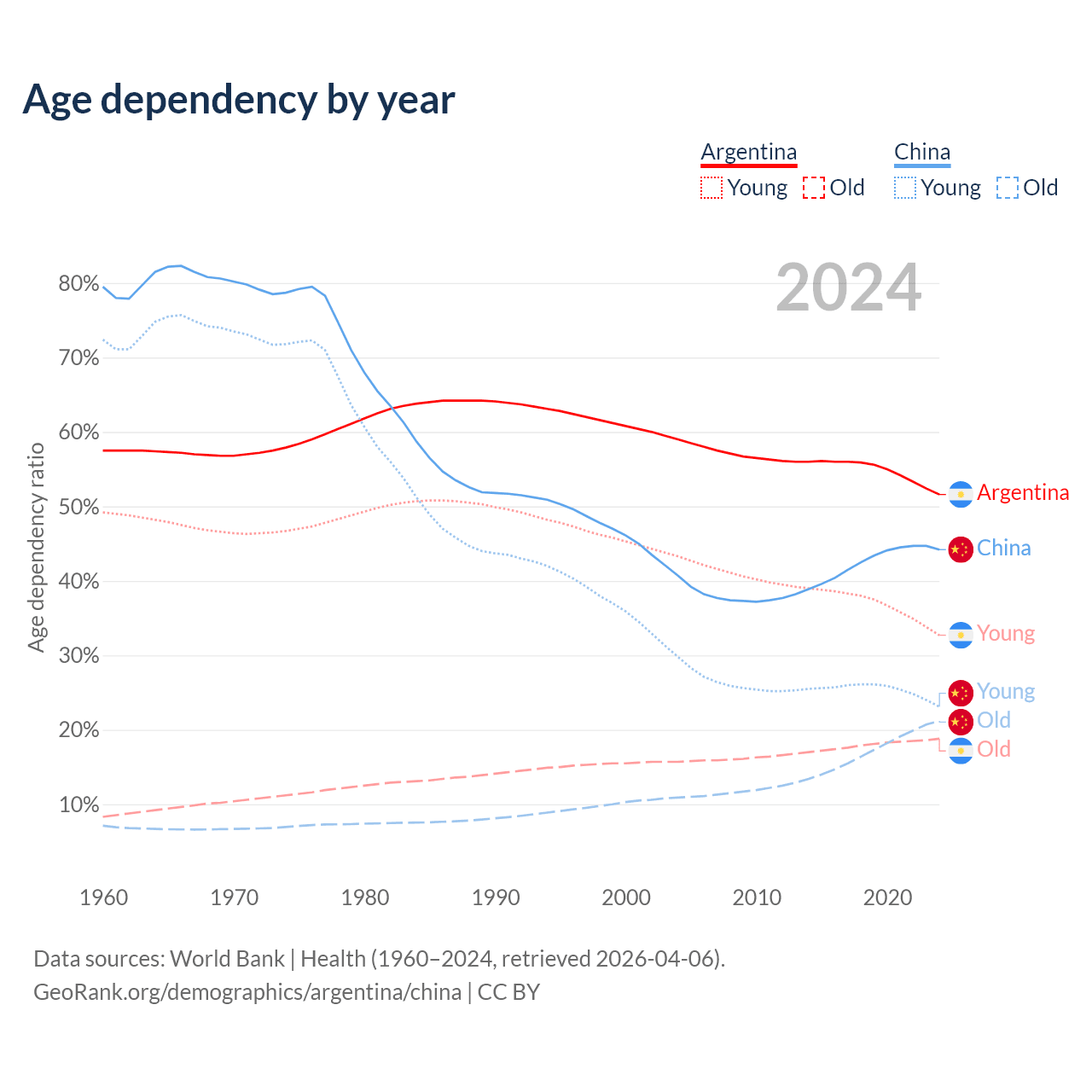 - Argentina is ranked 85/196 by median age (oldest to youngest) vs 44/196 for China.
