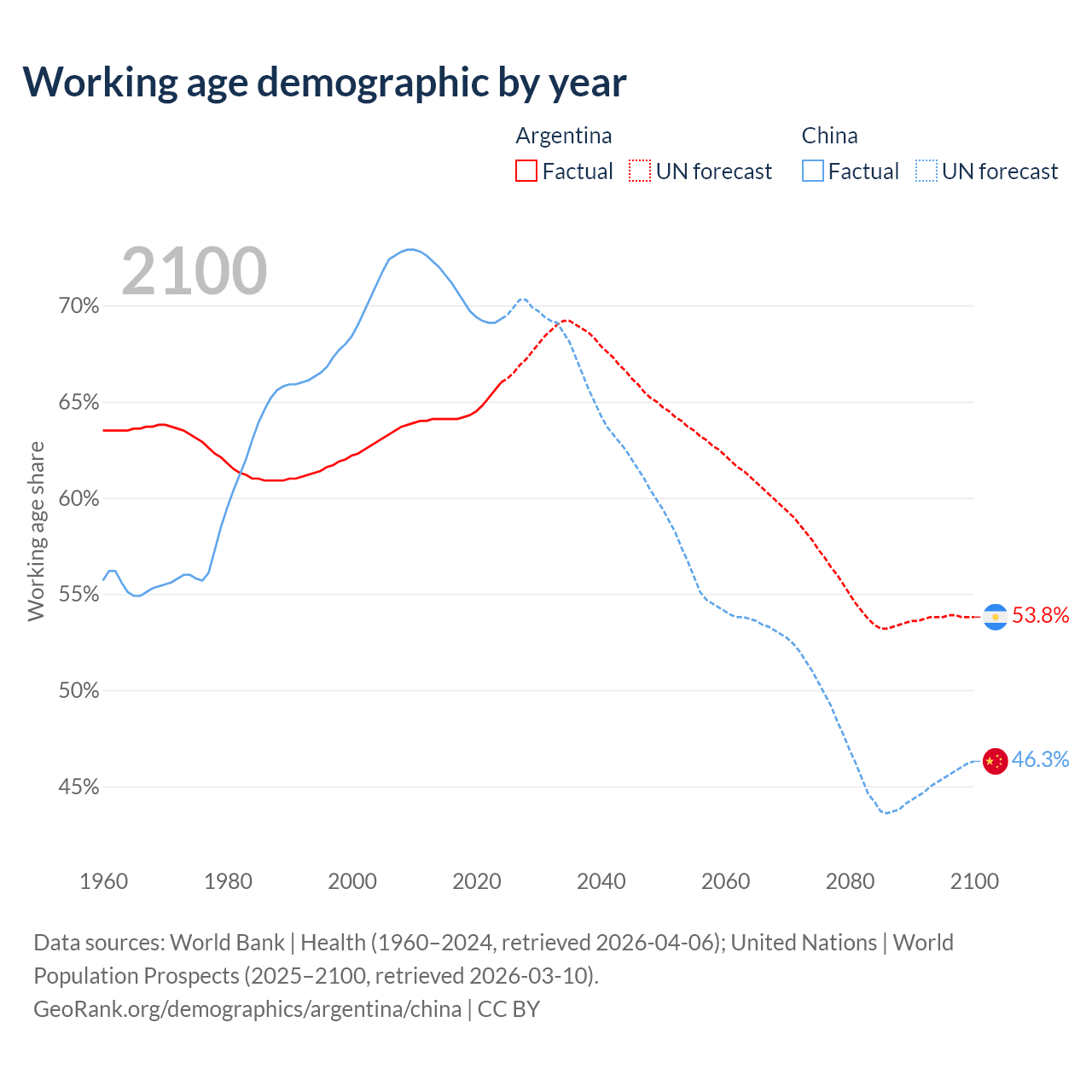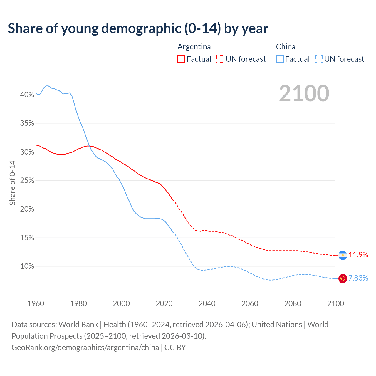 Median age Argentina vs China, 1960-2100