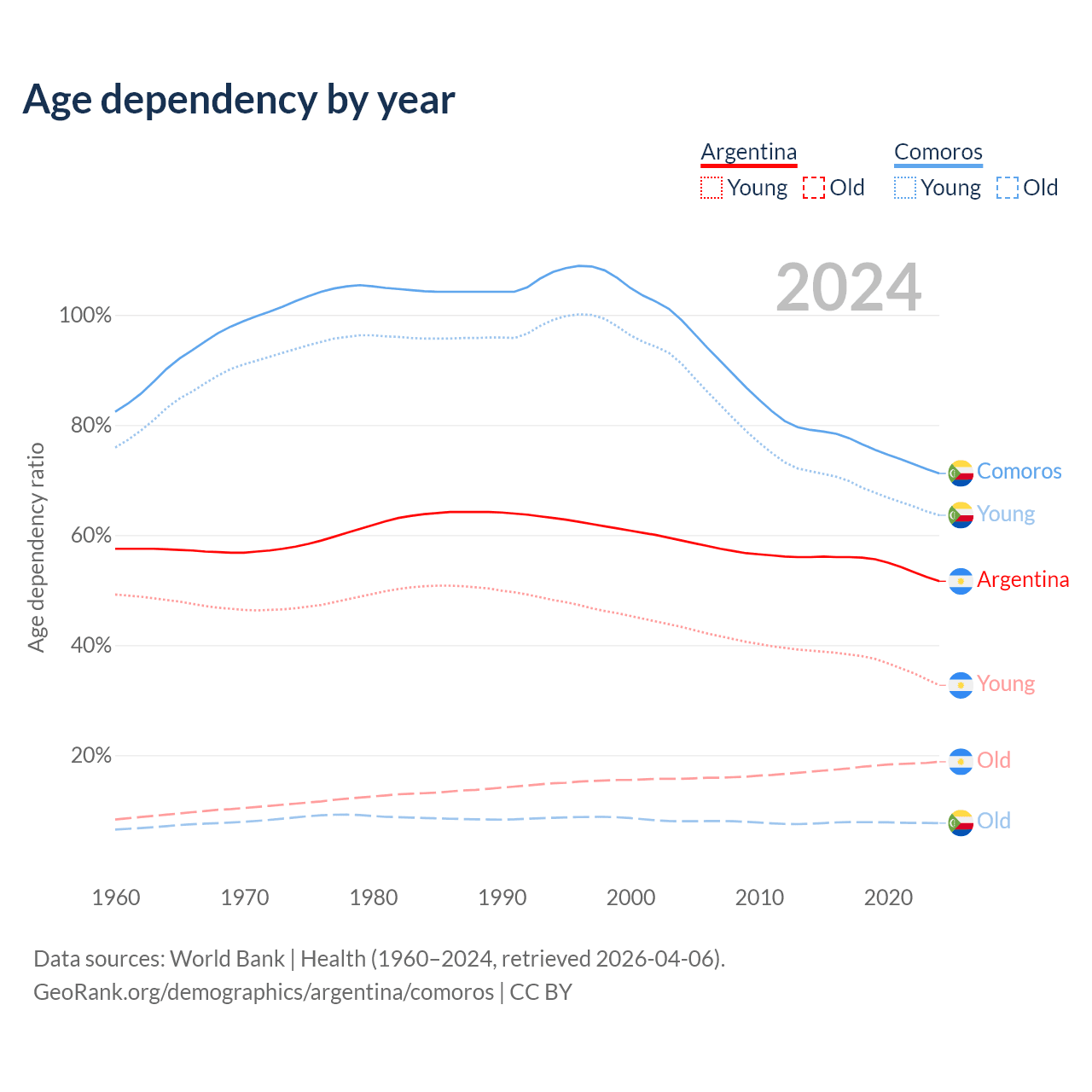 - Argentina is ranked 85/196 by median age (oldest to youngest) vs 152/196 for Comoros.